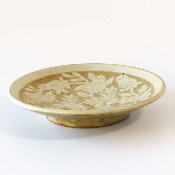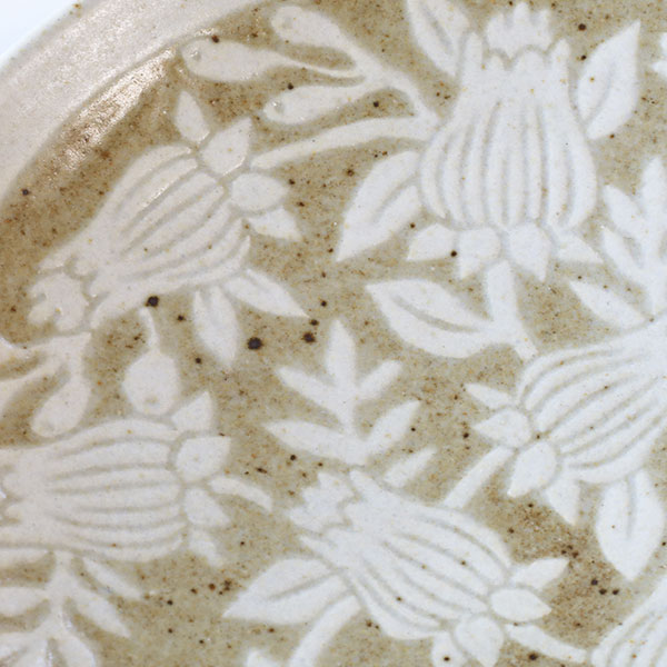 「掻き落とし」という伝統的な技法を使われており、ろくろで成形したあとに化粧泥と呼ばれる白い泥をかけ、ある程度乾燥させてから、ごく小さなヘラで化粧泥を掻き落として模様を描いていきます。