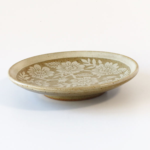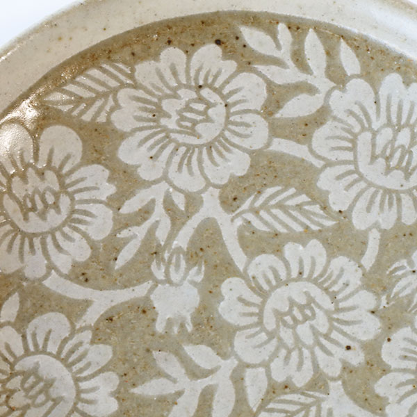 「掻き落とし」という伝統的な技法を使われており、ろくろで成形したあとに化粧泥と呼ばれる白い泥をかけ、ある程度乾燥させてから、ごく小さなヘラで化粧泥を掻き落として模様を描いていきます。