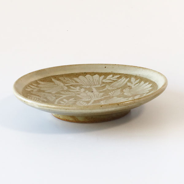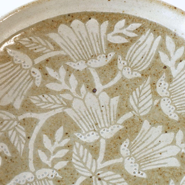 「掻き落とし」という伝統的な技法を使われており、ろくろで成形したあとに化粧泥と呼ばれる白い泥をかけ、ある程度乾燥させてから、ごく小さなヘラで化粧泥を掻き落として模様を描いていきます。