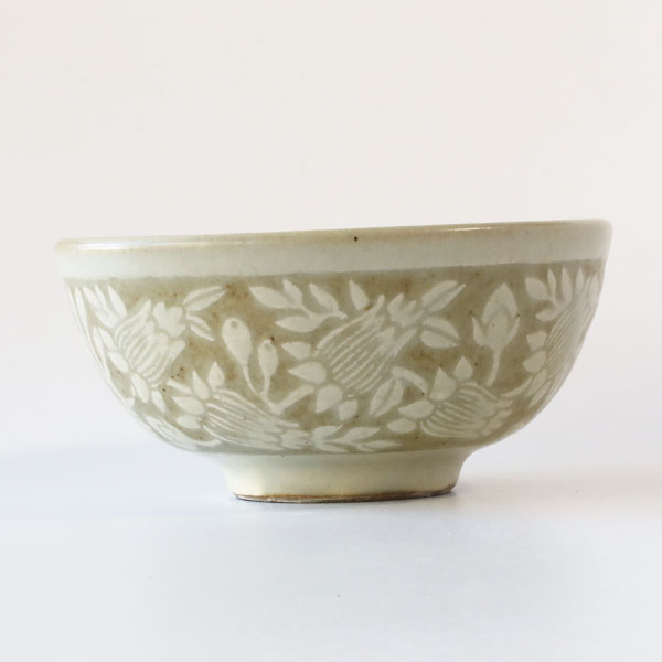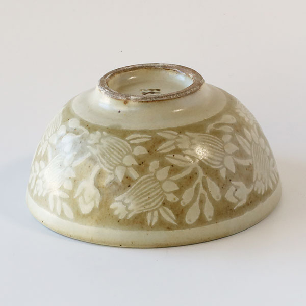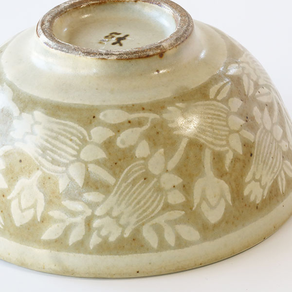 「掻き落とし」という伝統的な技法を使われており、ろくろで成形したあとに化粧泥と呼ばれる白い泥をかけ、ある程度乾燥させてから、ごく小さなヘラで化粧泥を掻き落として模様を描いていきます。