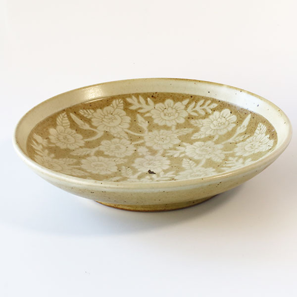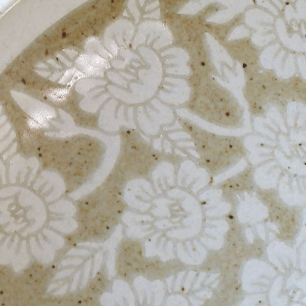 「掻き落とし」という伝統的な技法を使われており、ろくろで成形したあとに化粧泥と呼ばれる白い泥をかけ、ある程度乾燥させてから、ごく小さなヘラで化粧泥を掻き落として模様を描いていきます。