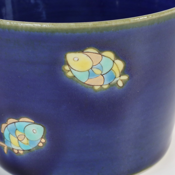 そんな立体的な上絵に「雪輪」では平面的な下絵を、「魚文」では華やかさを添える金彩を、「花文尽くし」では質感や色のトーンが違う釉薬での表現を組み合わせています。