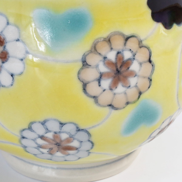 花坂陶石を原料とした磁器土で作った器に、九谷焼の上絵の技法で絵付けをしています。