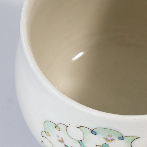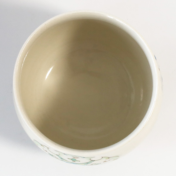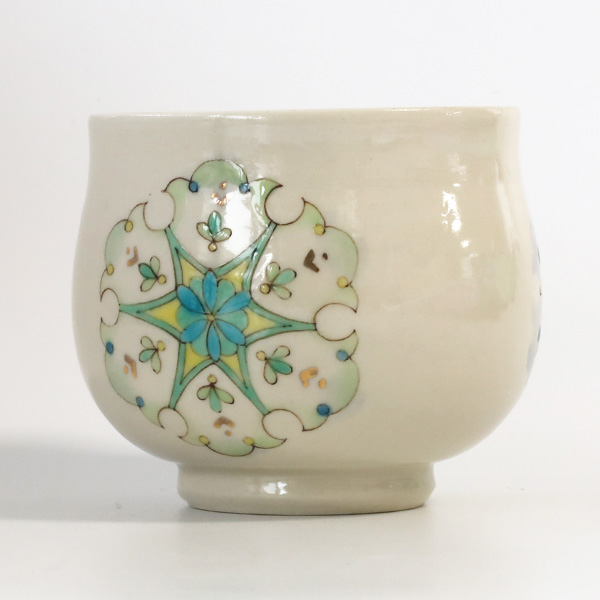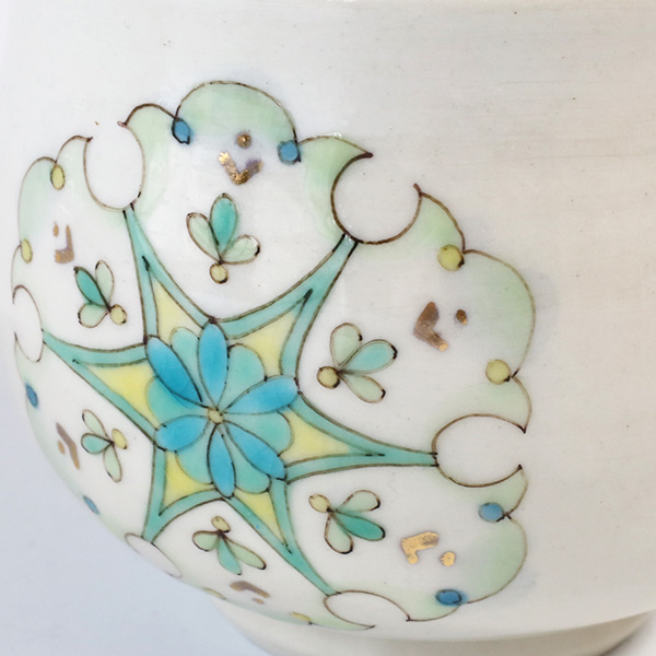 花坂陶石を原料とした磁器土で作った器に、九谷焼の上絵の技法で絵付けをしています。