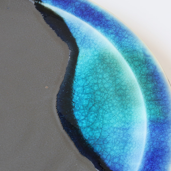 主に海をイメージし、波のようなデザインと3種類のガラス釉薬を使い分け、同じ色合いは出せない作品たち。