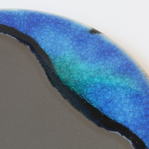 主に海をイメージし、波のようなデザインと3種類のガラス釉薬を使い分け、同じ色合いは出せない作品たち。
