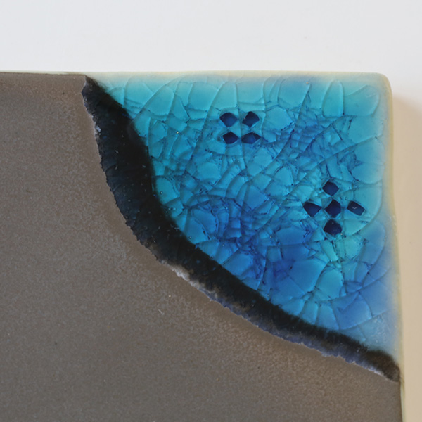 主に海をイメージし、波のようなデザインと3種類のガラス釉薬を使い分け、同じ色合いは出せない作品たち。
