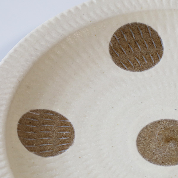 小石原焼の伝統技法である飛鉋を用いながら、水玉等の模様を組み合わせて、親しみのあるデザインに仕上げているのが特徴です。