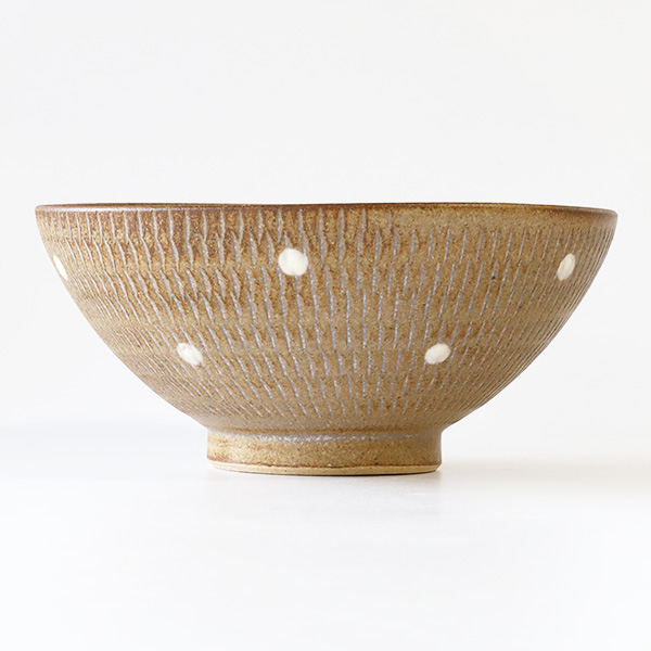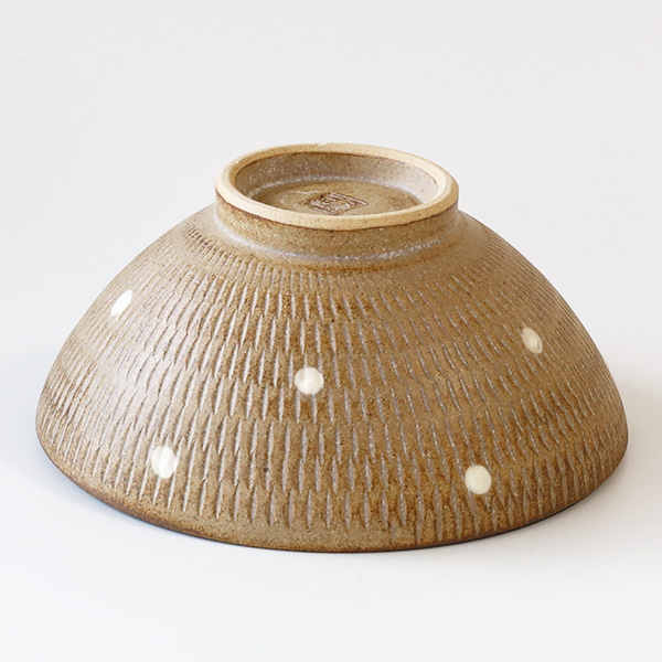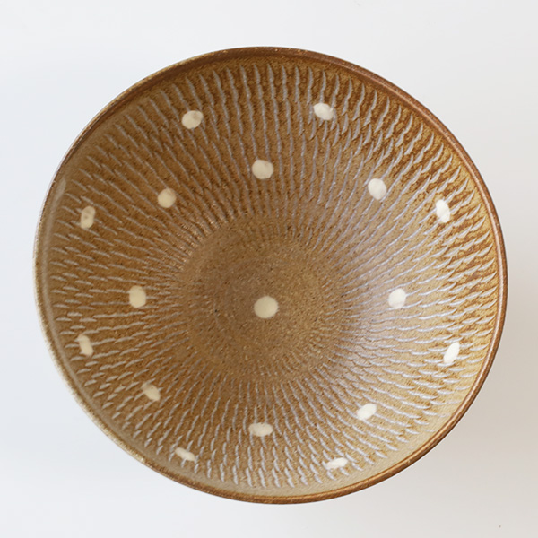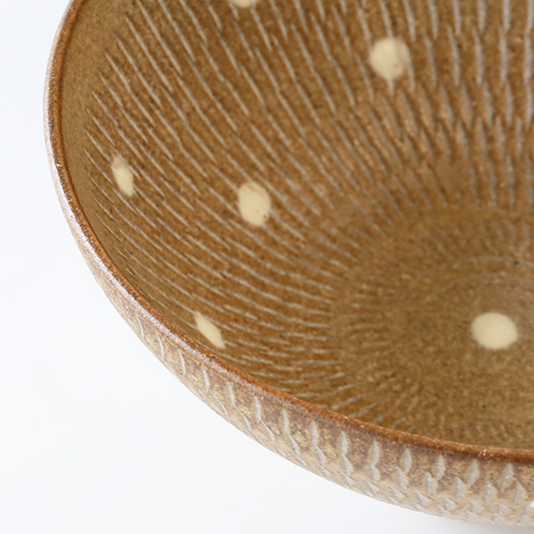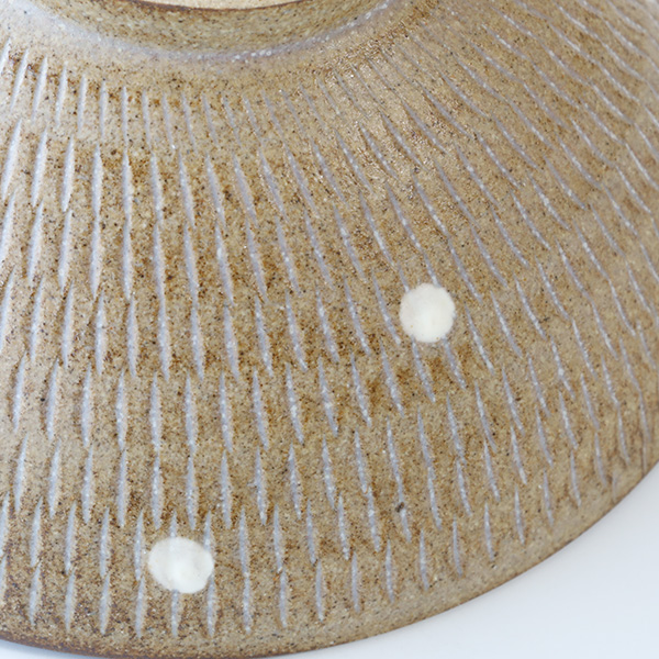 小石原焼の伝統技法である飛鉋を用いながら、水玉等の模様を組み合わせて、親しみのあるデザインに仕上げているのが特徴です。