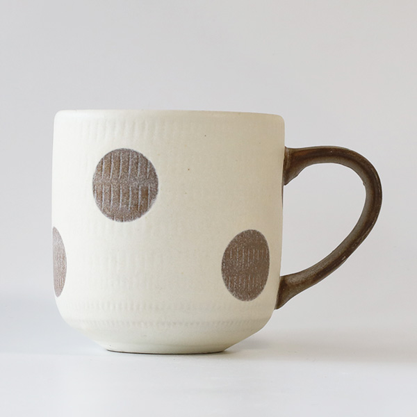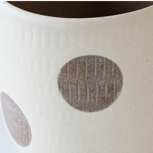 小石原焼の伝統技法である飛鉋を用いながら、水玉等の模様を組み合わせて、親しみのあるデザインに仕上げているのが特徴です。