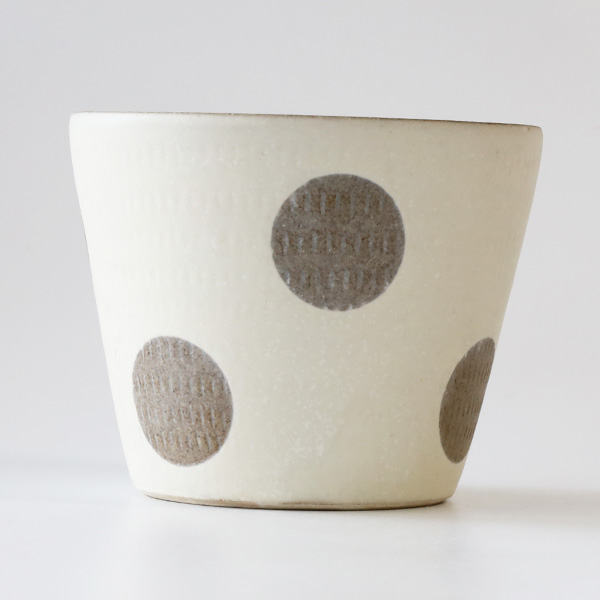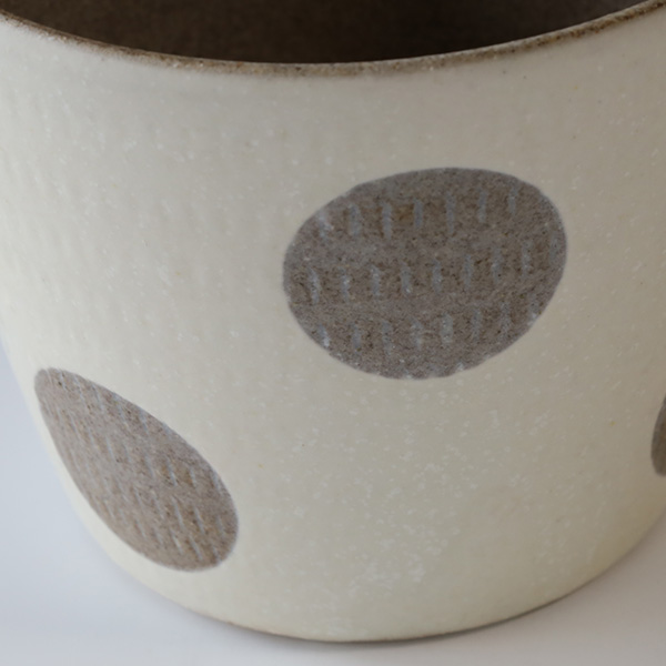 小石原焼の伝統技法である飛鉋を用いながら、水玉等の模様を組み合わせて、親しみのあるデザインに仕上げているのが特徴です。