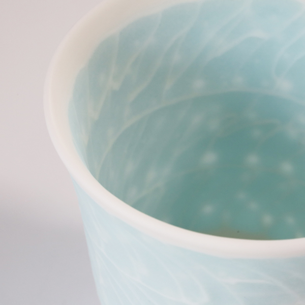 通常、磁器土に貝殻を混ぜると磁土と貝のカルシウムが反応して溶けて崩れてしまいますが、調合や焼き方を工夫することで器の形を保ち美しい作品が生まれます。
