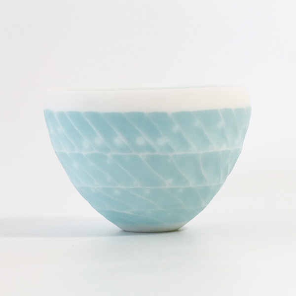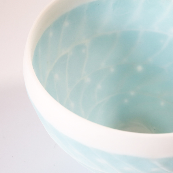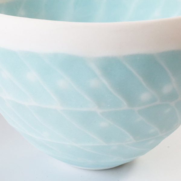 通常、磁器土に貝殻を混ぜると磁土と貝のカルシウムが反応して溶けて崩れてしまいますが、調合や焼き方を工夫することで器の形を保ち美しい作品が生まれます。