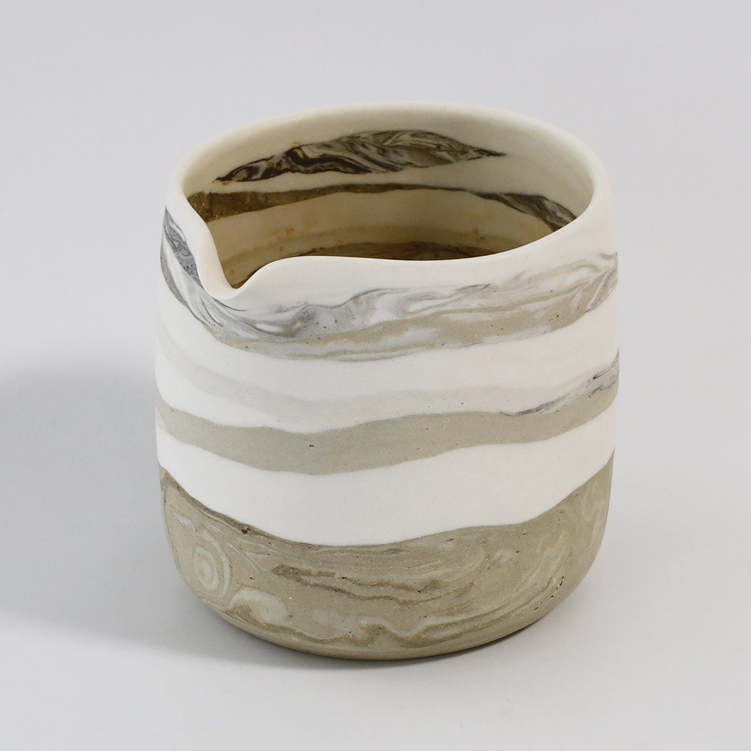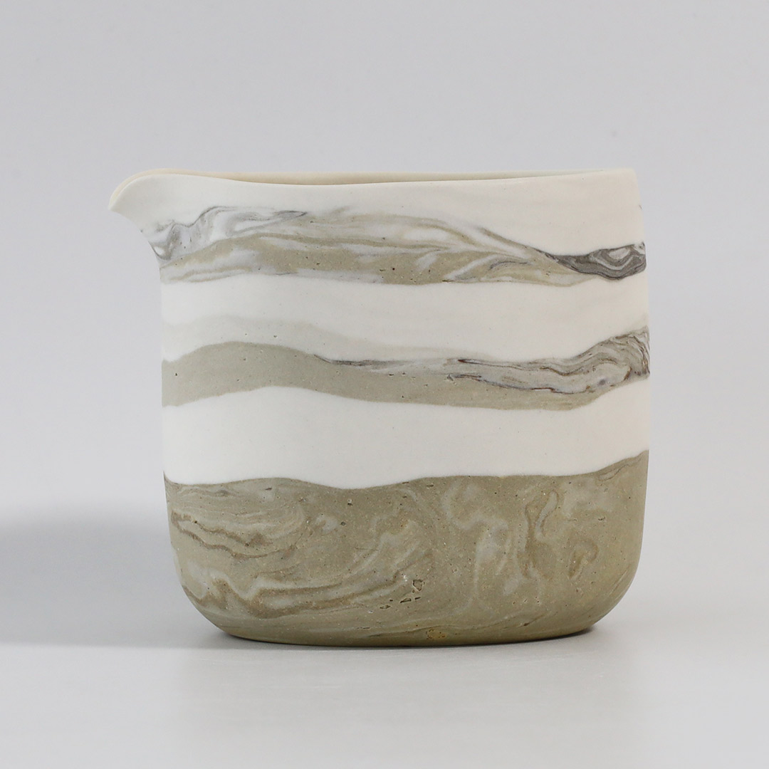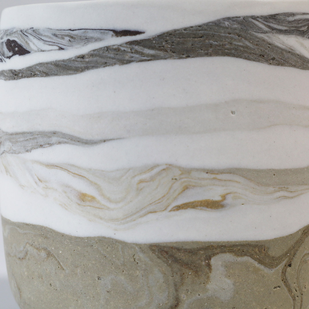 紐状の粘土を積み上げて成形し、その際、紐の太さや長さを変えて積み上げていくことで、地層のような模様を形成しています。