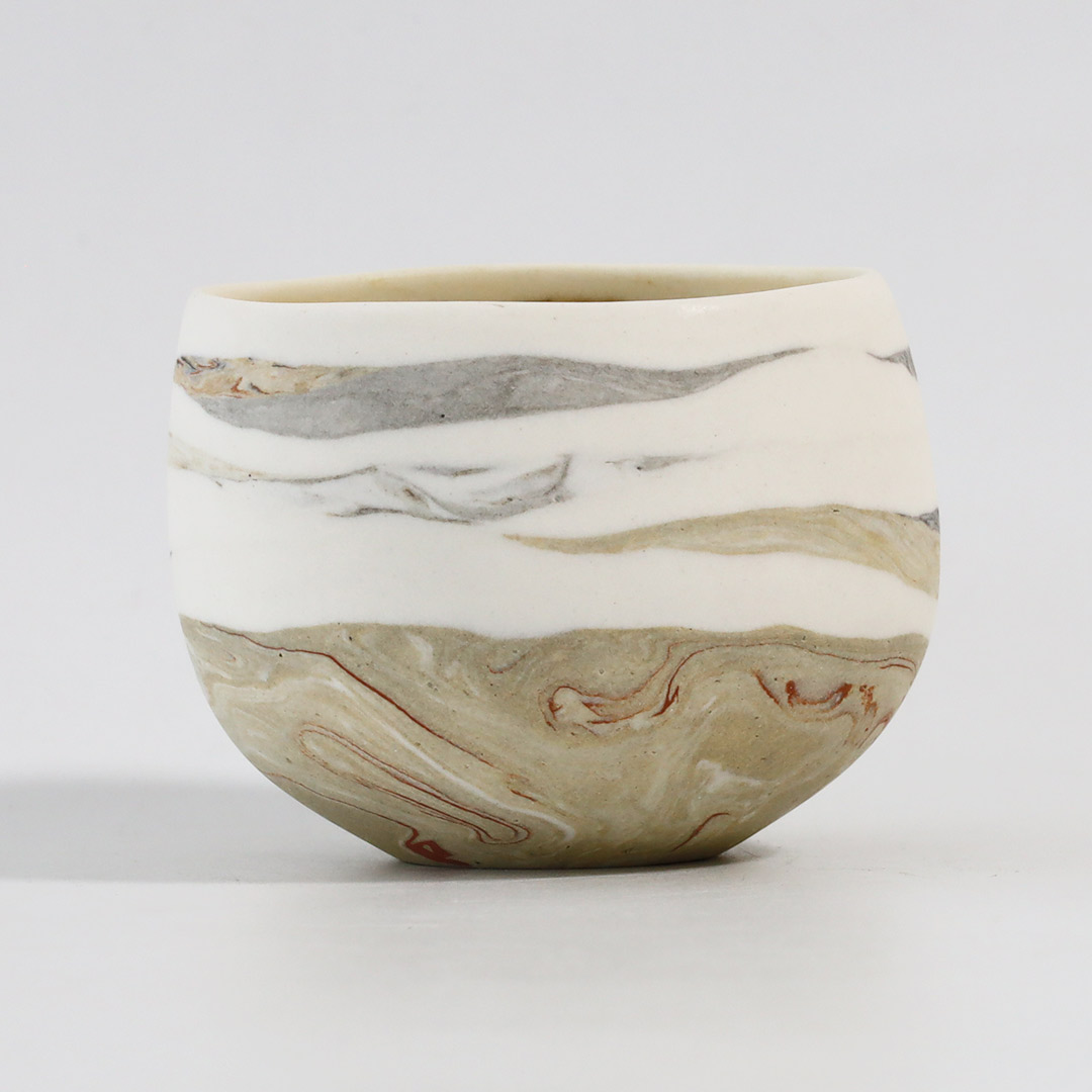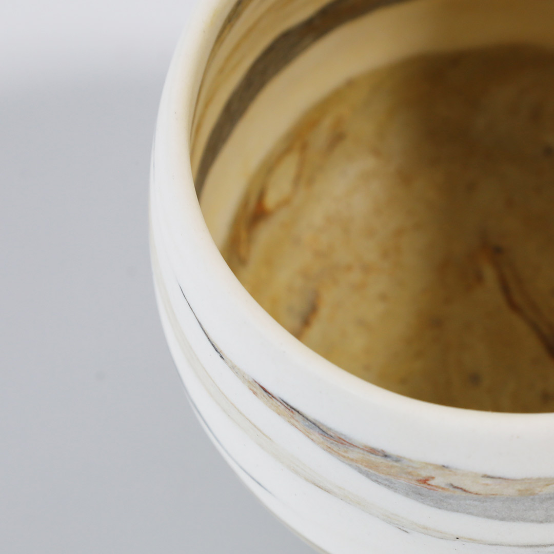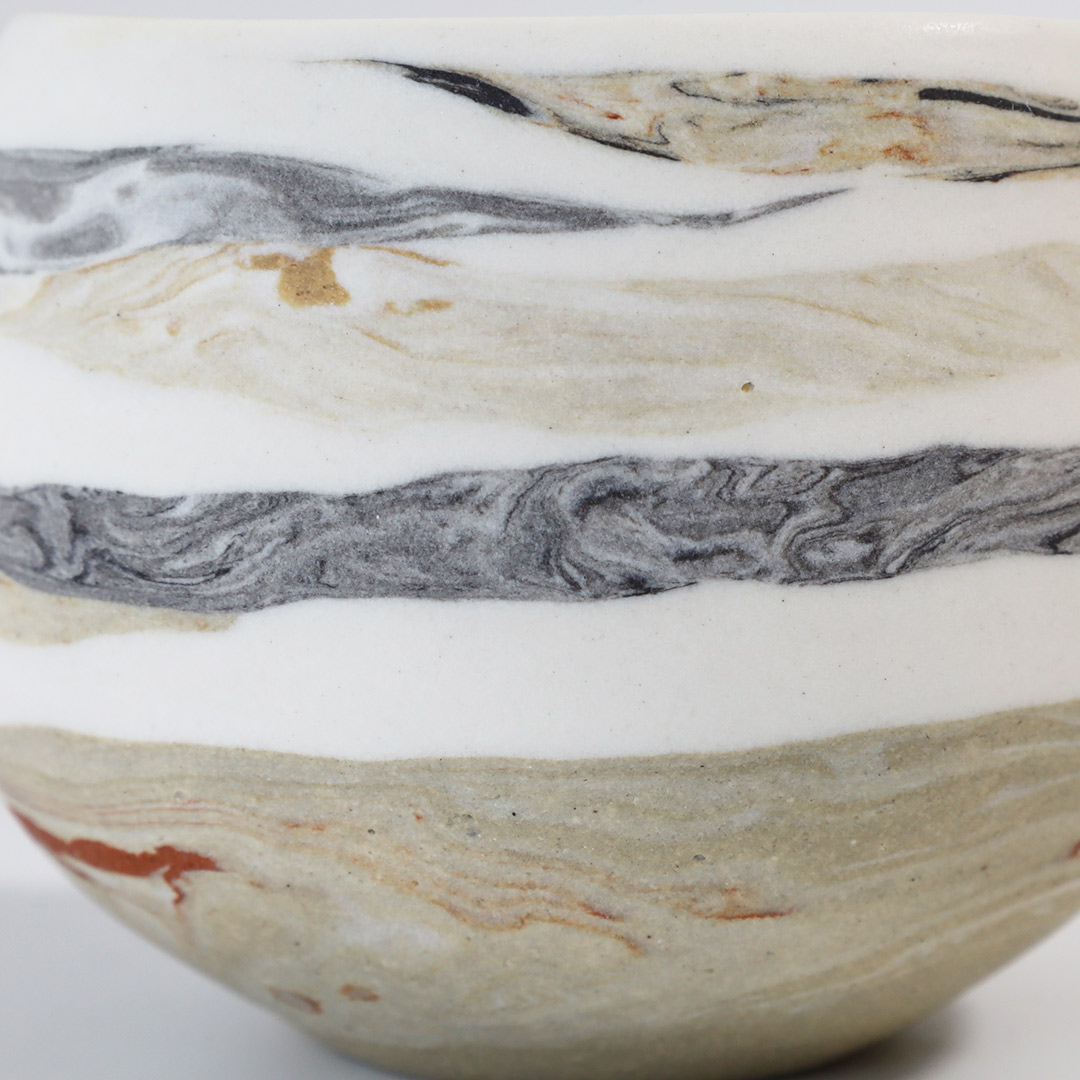 紐状の粘土を積み上げて成形し、その際、紐の太さや長さを変えて積み上げていくことで、地層のような模様を形成しています。