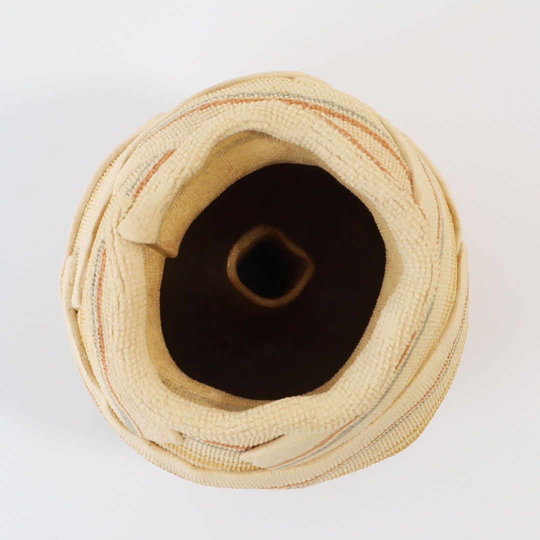 布を巻き付けたような個性的な巾着型の花器です。