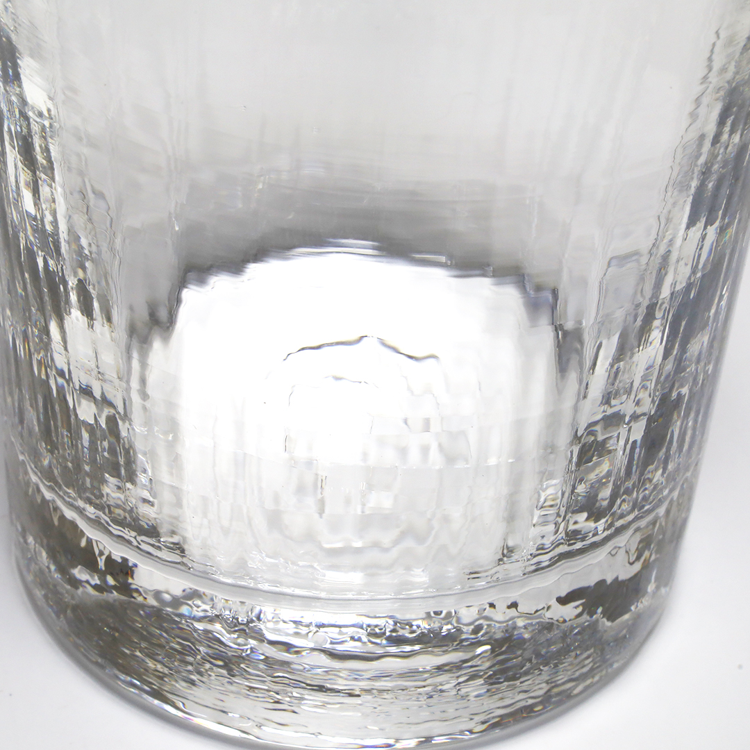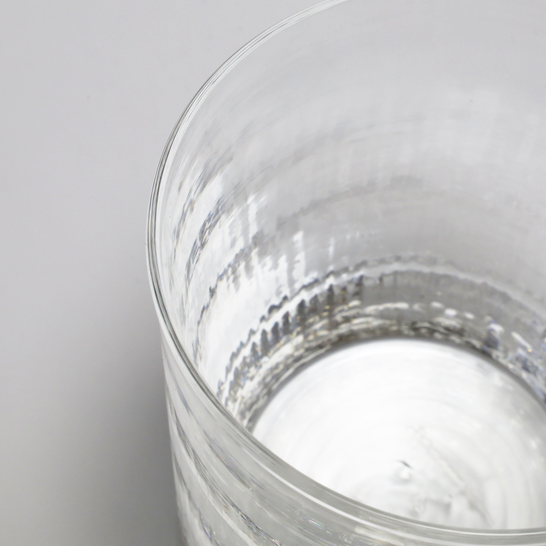 熔解炉(窯)を自作し、珪砂をはじめとした10数種類のガラス原料を選定・調合、吹く時に型を使うときは型を自作するなど、ガラスに関することはできる限り自分たちの手でおこなっています。、シンプルながら印象に残るテクスチャが光を受けて輝きます。