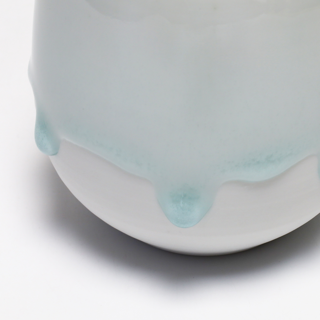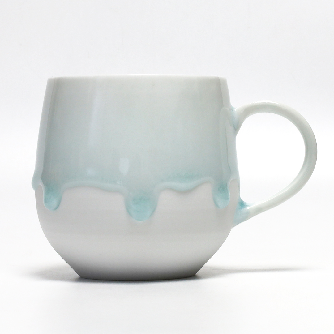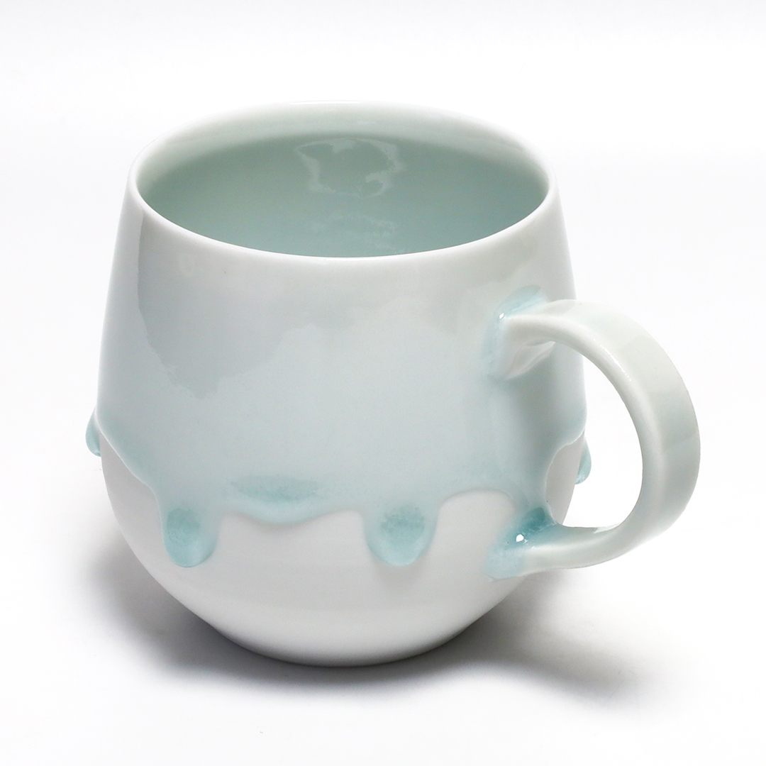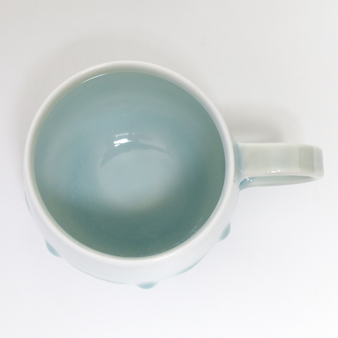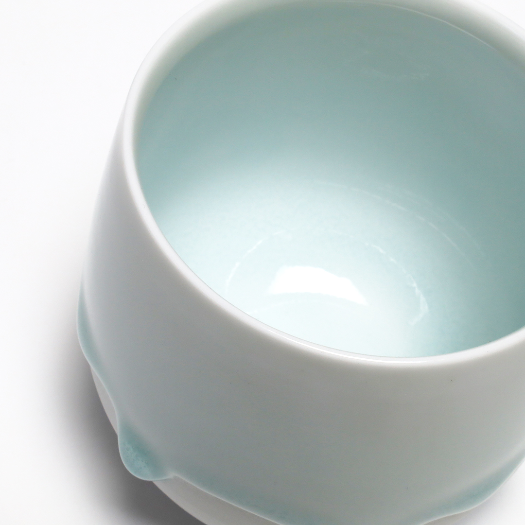 主に磁器土を使った器を作っています。白磁の土に透き通った水色の艶のある彫線を施した青磁のほか、マットな釉薬に十草模様の日用食器も特徴です。