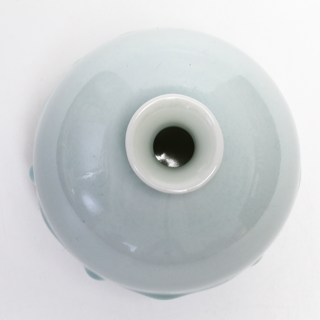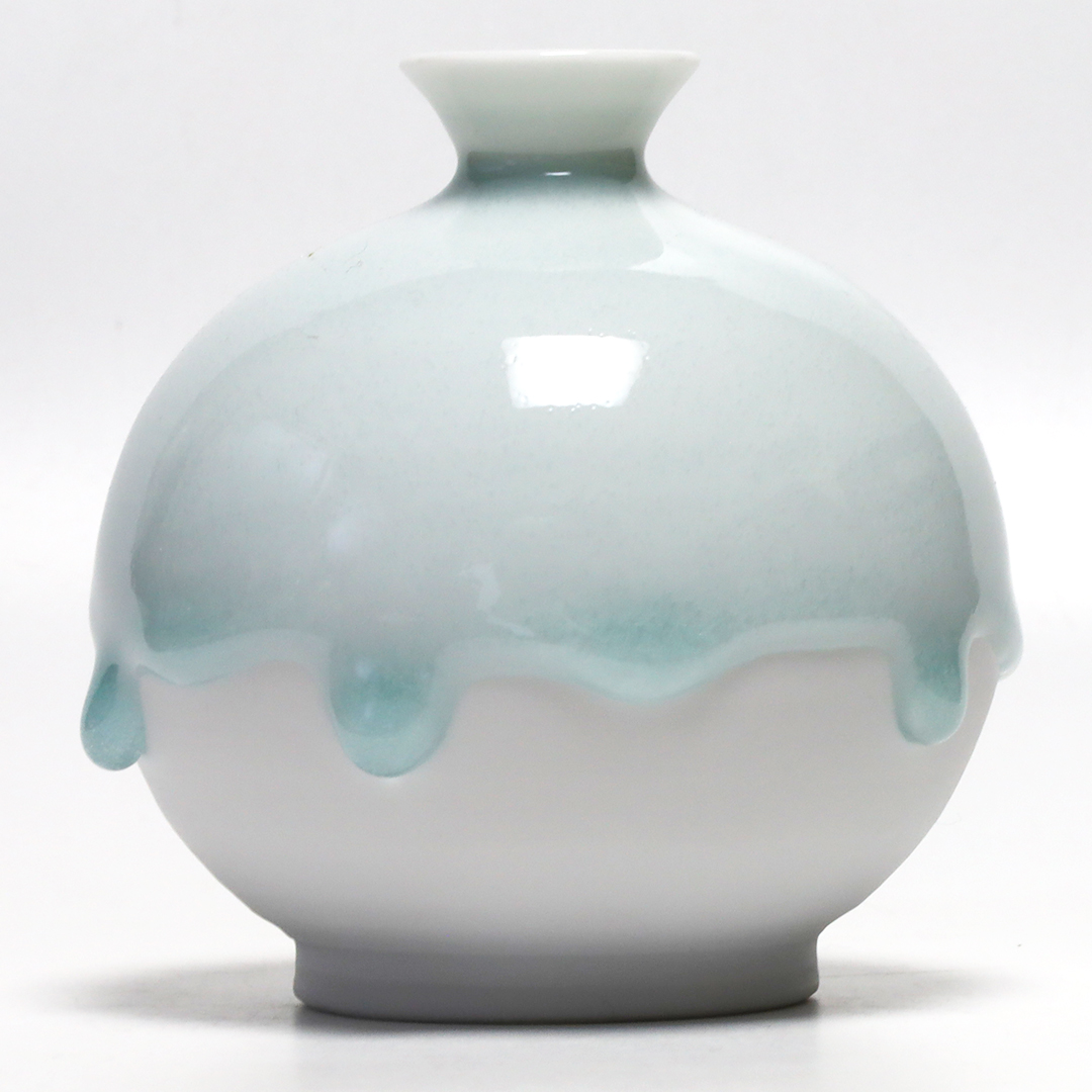 主に磁器土を使った器を作っています。白磁の土に透き通った水色の艶のある彫線を施した青磁のほか、マットな釉薬に十草模様の日用食器も特徴です。