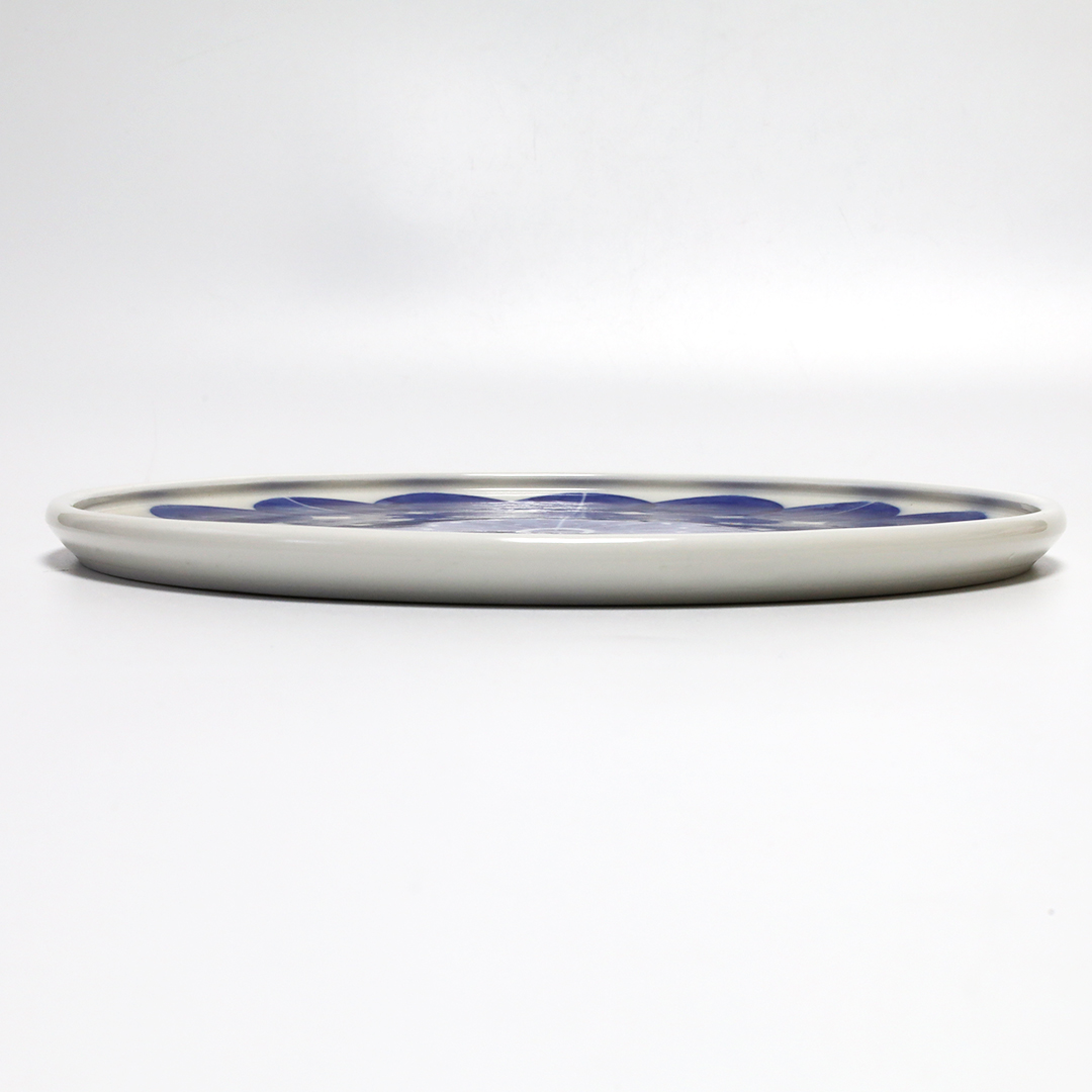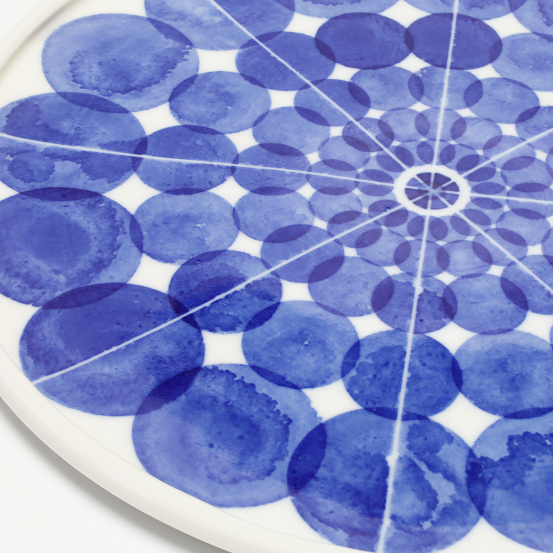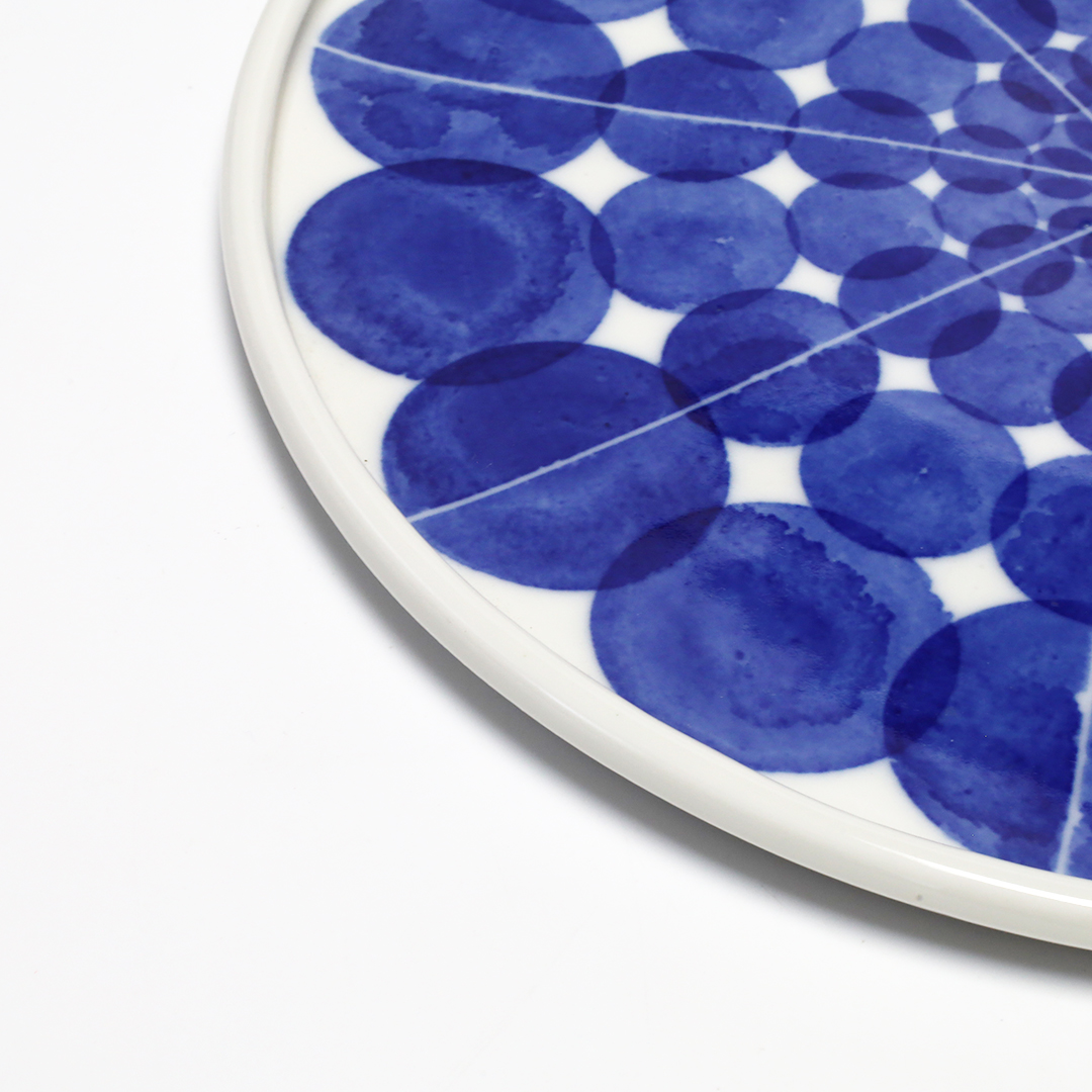 「和紙染め」という染付技法を中心に製作しています。絵付けをするときに和紙を通して色付けすることで紙の質感や形を器に写すことができます。切り絵と貼り絵を合わせたような風合いになるのが特徴です。また、使い勝手を考えられた形状をしているので使いやすい器です。