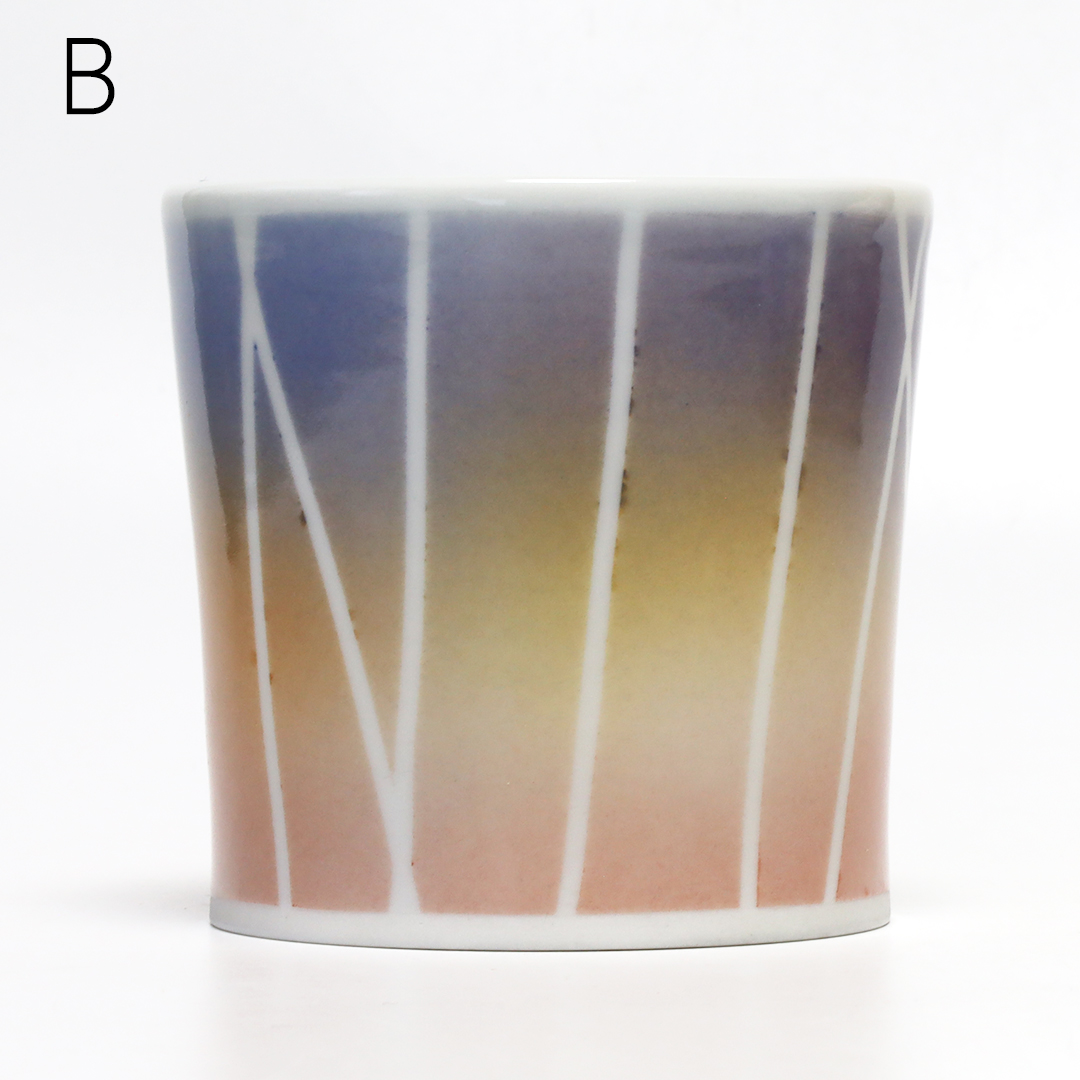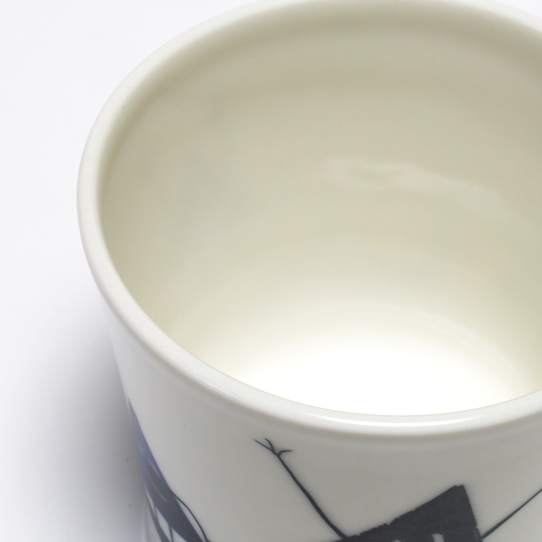 「和紙染め」という染付技法を中心に製作しています。絵付けをするときに和紙を通して色付けすることで紙の質感や形を器に写すことができます。切り絵と貼り絵を合わせたような風合いになるのが特徴です。また、使い勝手を考えられた形状をしているので使いやすい器です。