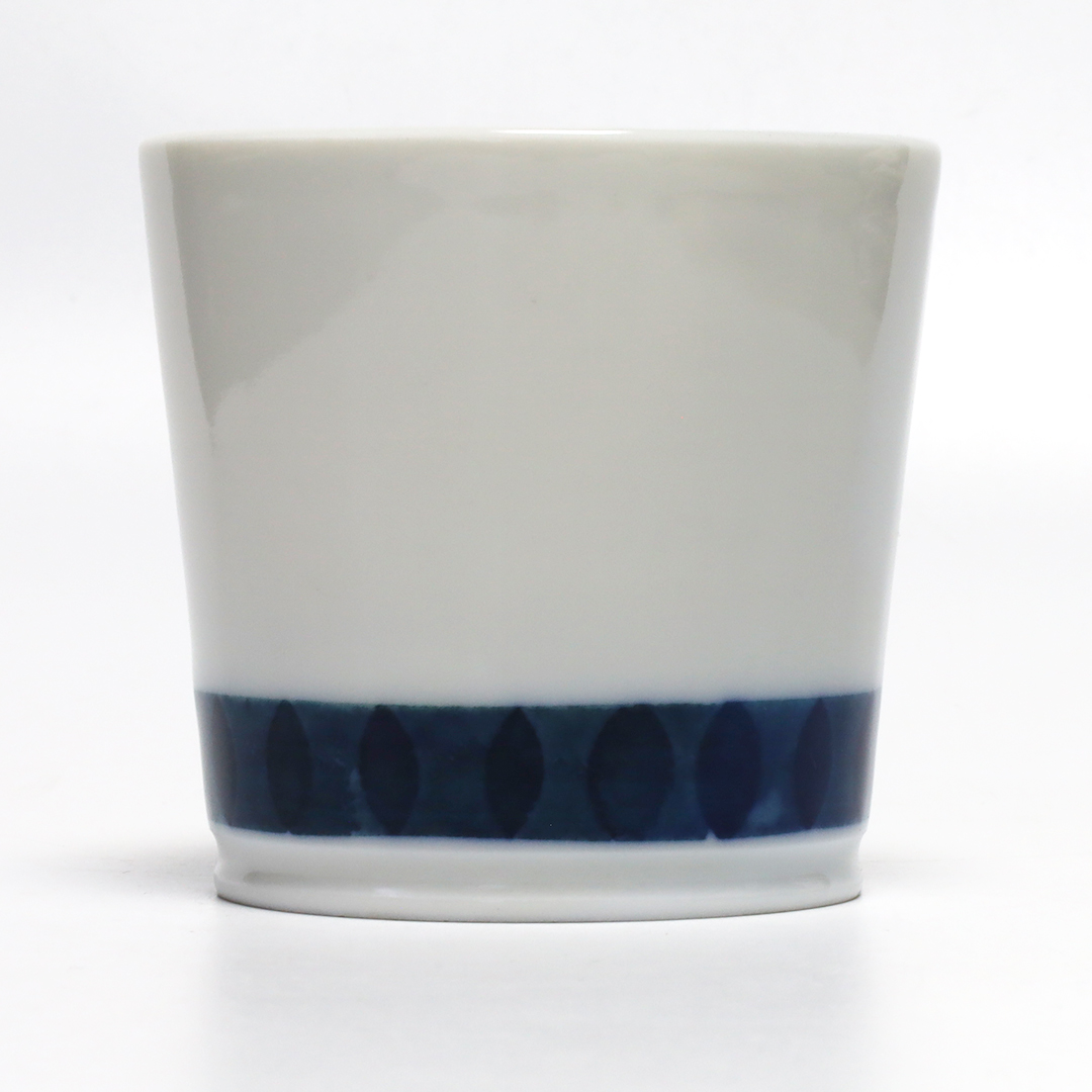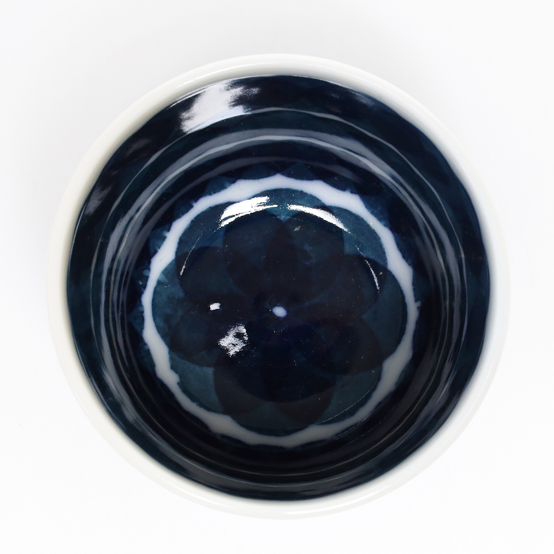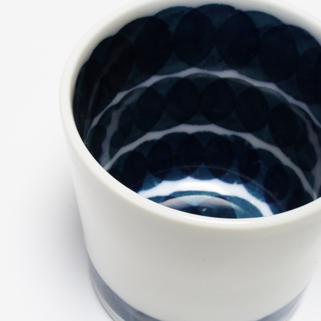 「和紙染め」という染付技法を中心に製作しています。絵付けをするときに和紙を通して色付けすることで紙の質感や形を器に写すことができます。切り絵と貼り絵を合わせたような風合いになるのが特徴です。また、使い勝手を考えられた形状をしているので使いやすい器です。