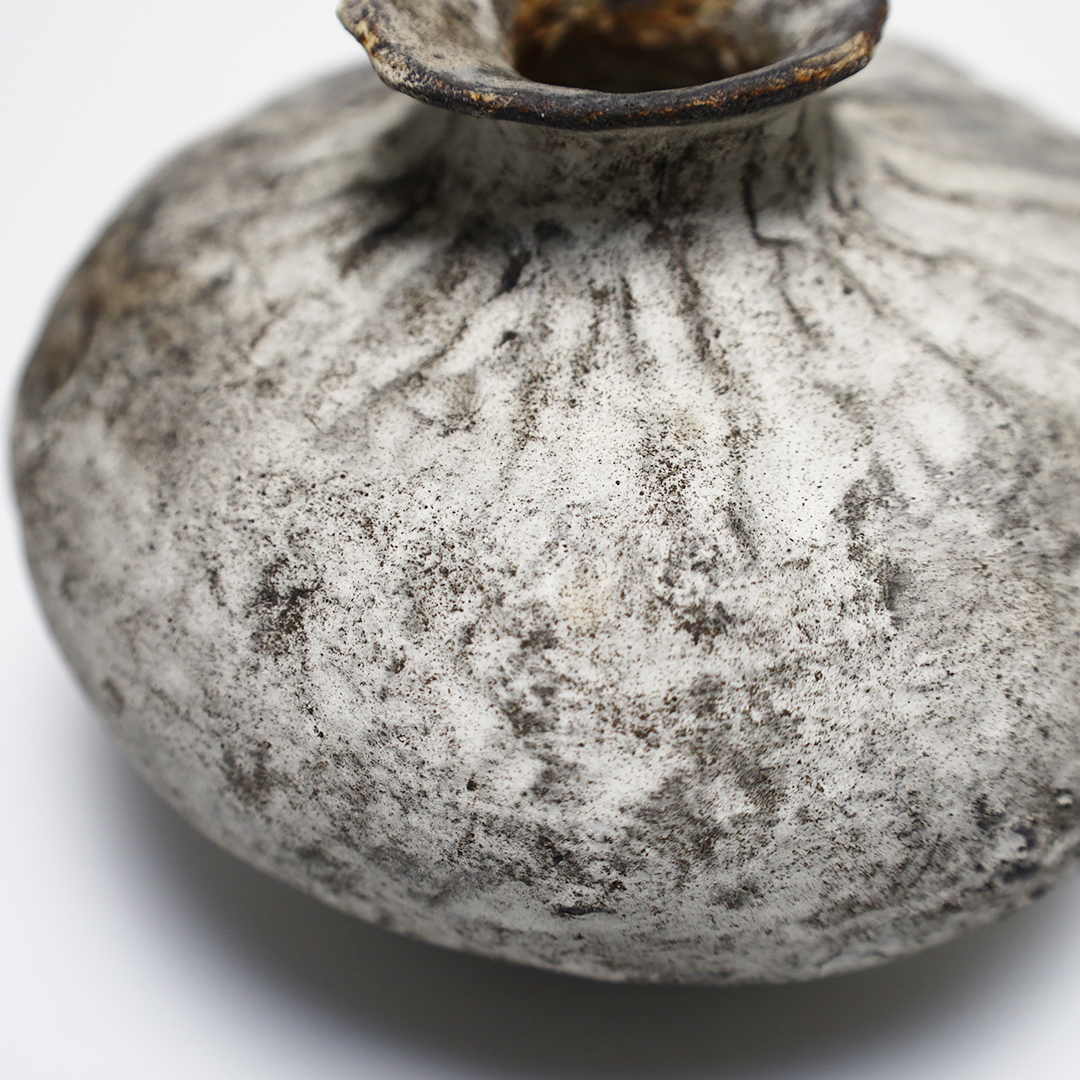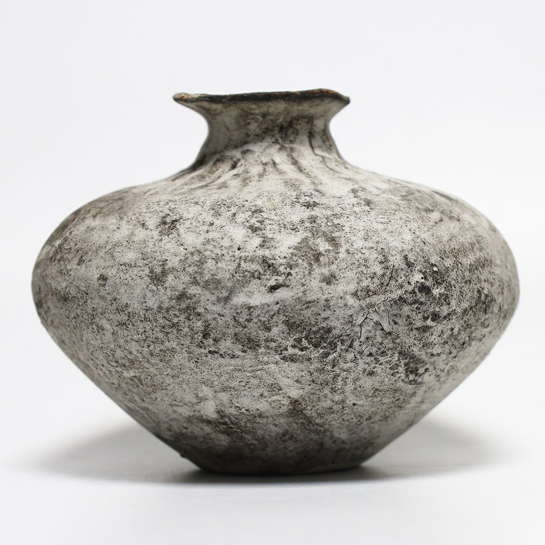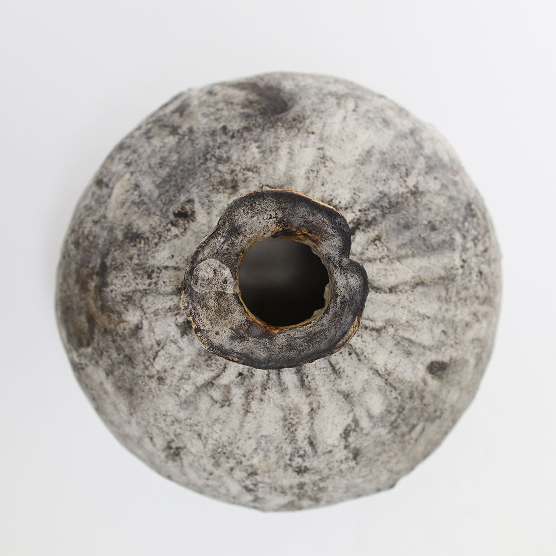 手捻りや型を用いて成形したのち、作品を水に沈め、自然に造形を委ねながら、作為と無作為のあわいを漂いながら作られ、時を積み重ねたような風合いを出しています。