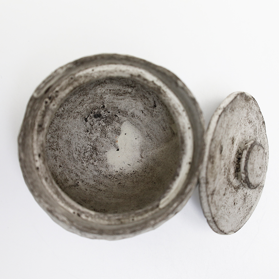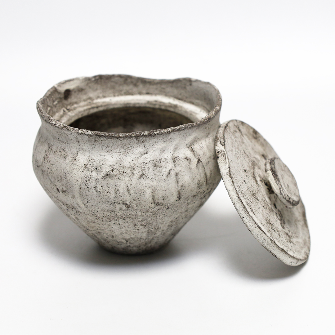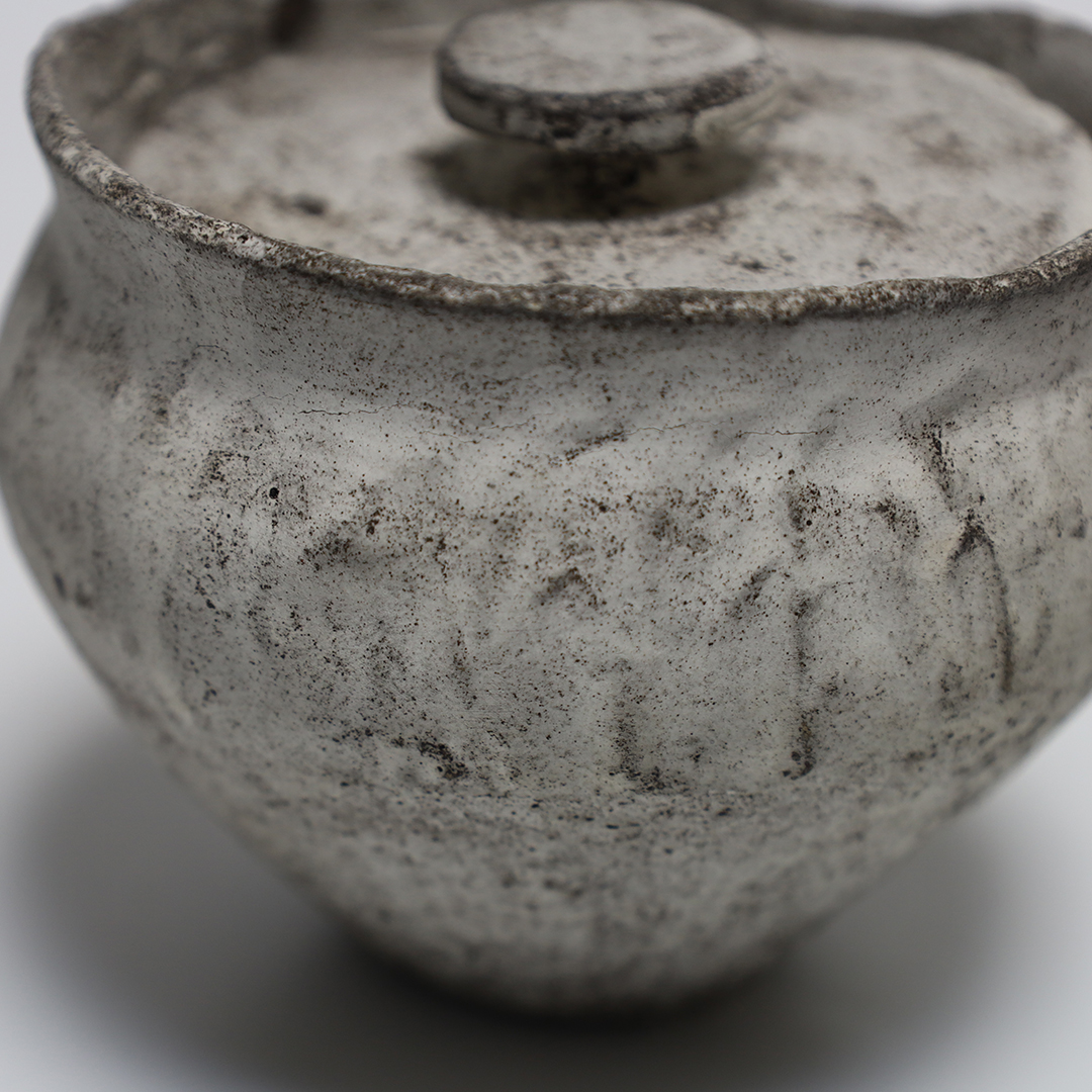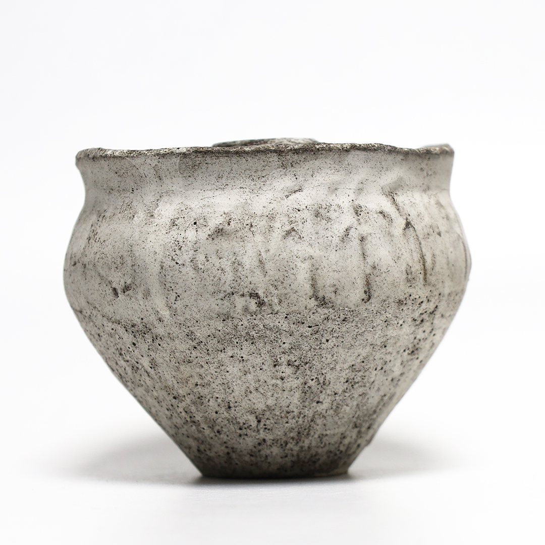 手捻りや型を用いて成形したのち、作品を水に沈め、自然に造形を委ねながら、作為と無作為のあわいを漂いながら作られ、時を積み重ねたような風合いを出しています。