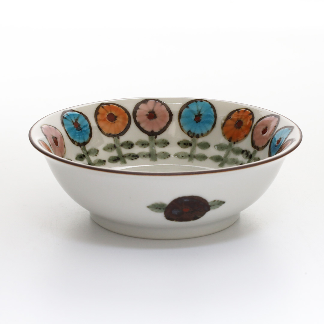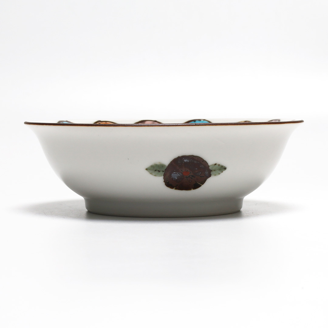 特に、九谷焼の五彩「赤」「青」「黄」「紺青」「紫」の色にこだわりをもっており、独自の配合の絵具を用いて、納得のいく色が出るまで何度も窯に入れるなど、丁寧な加飾をされています。