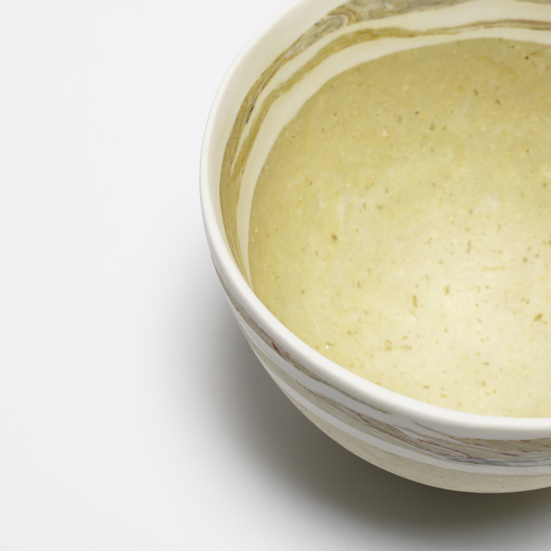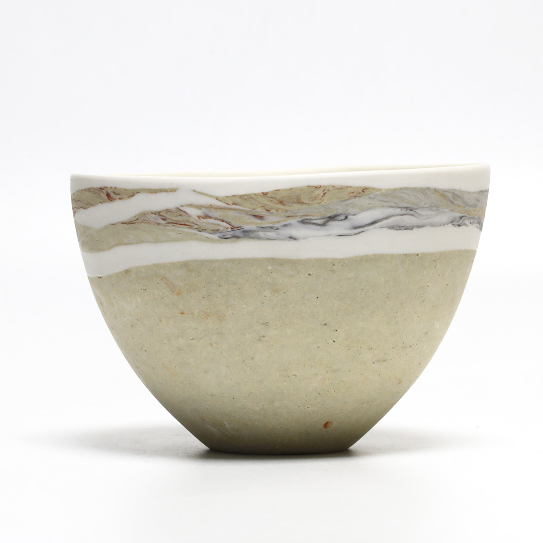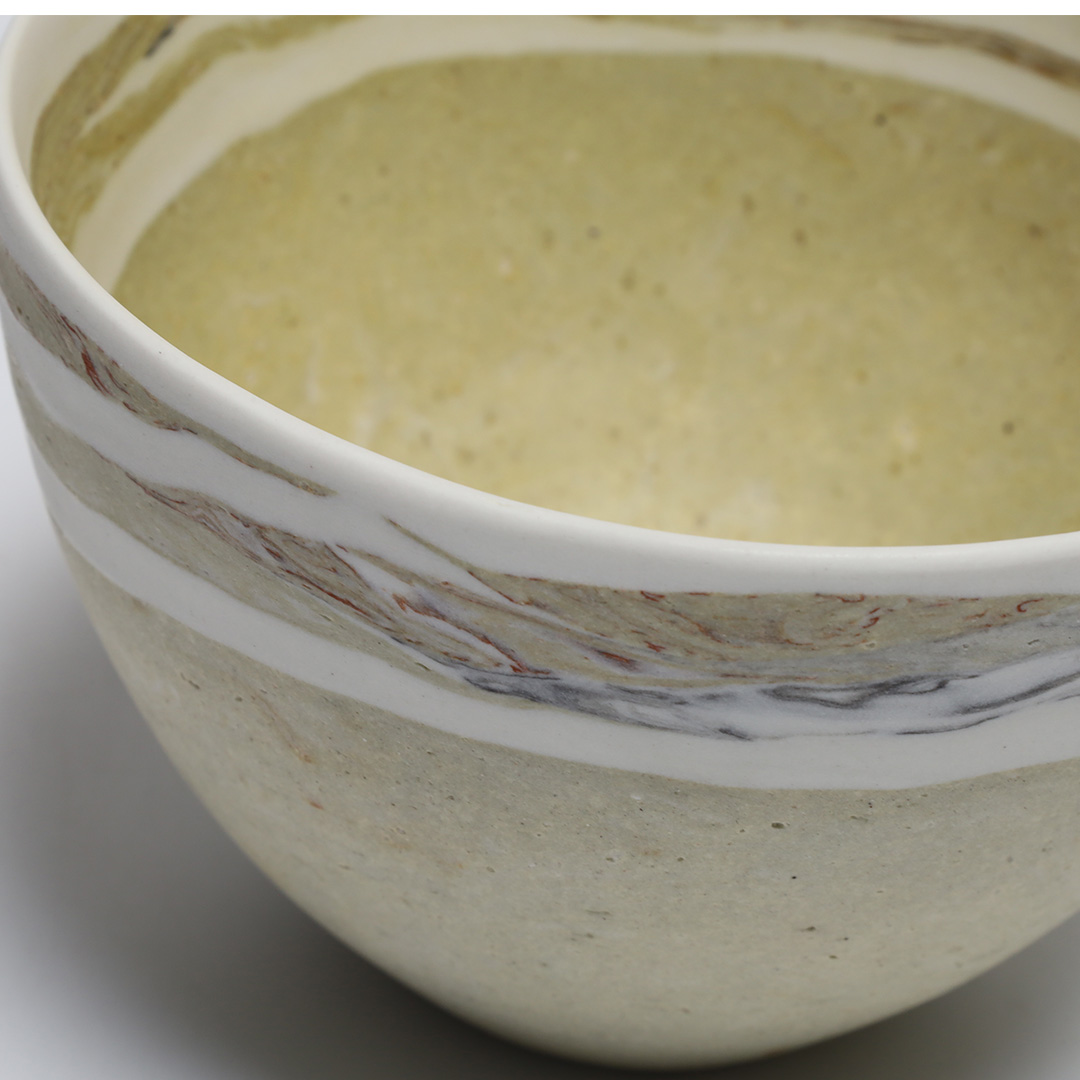 紐状の粘土を積み上げて成形し、その際、紐の太さや長さを変えて積み上げていくことで、地層のような模様を形成しています。