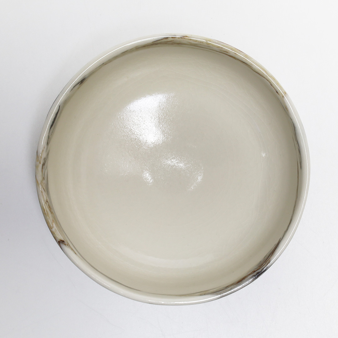 紐状の粘土を積み上げて成形し、その際、紐の太さや長さを変えて積み上げていくことで、地層のような模様を形成しています。