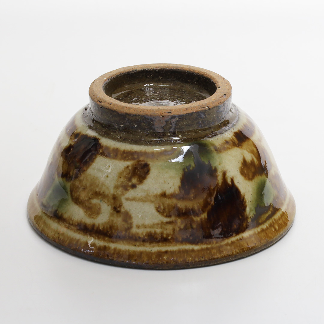 土っぽさを残した素朴な味わいの器に大胆ながらも柔らかみのある模様を施しています。