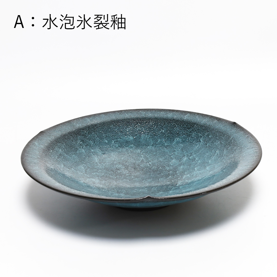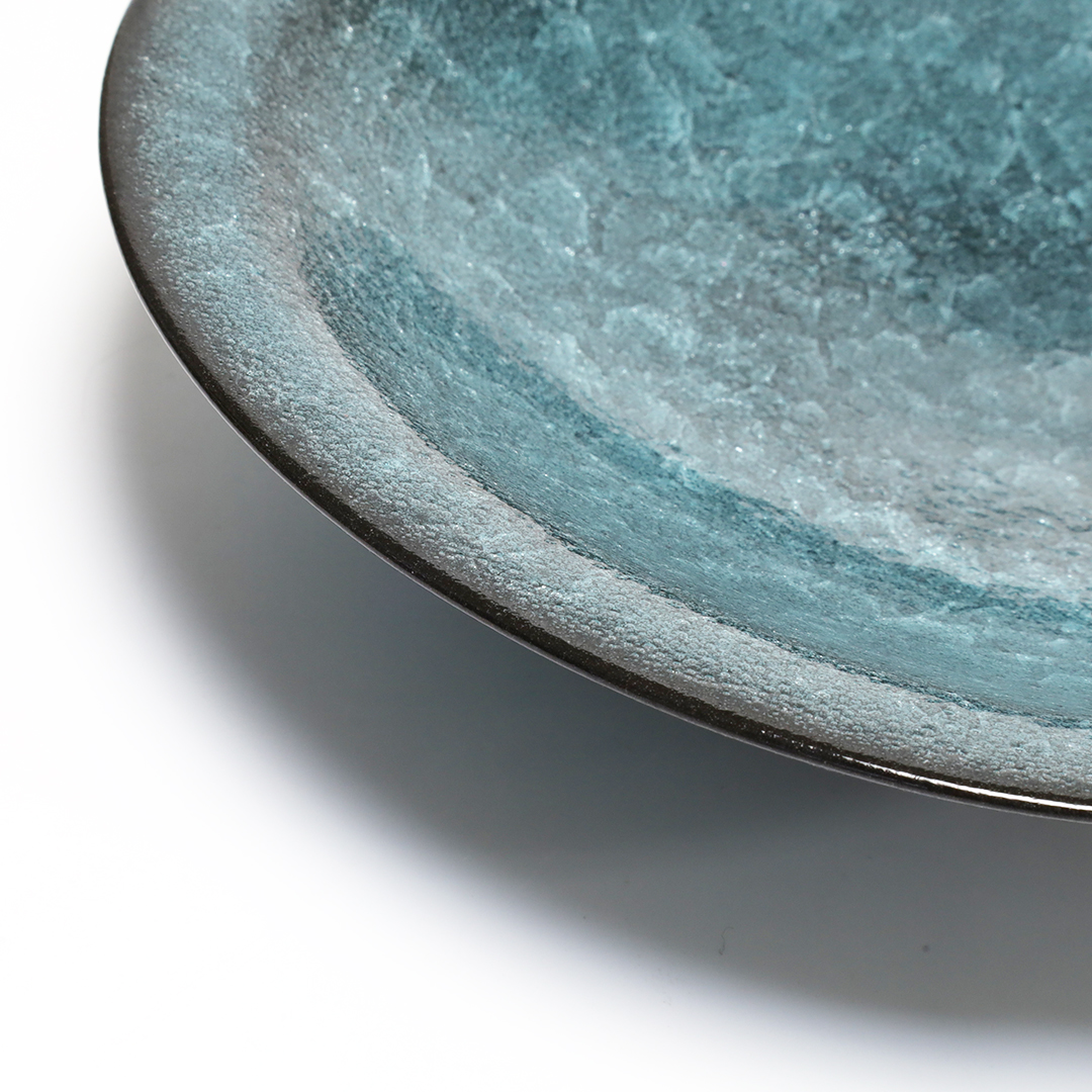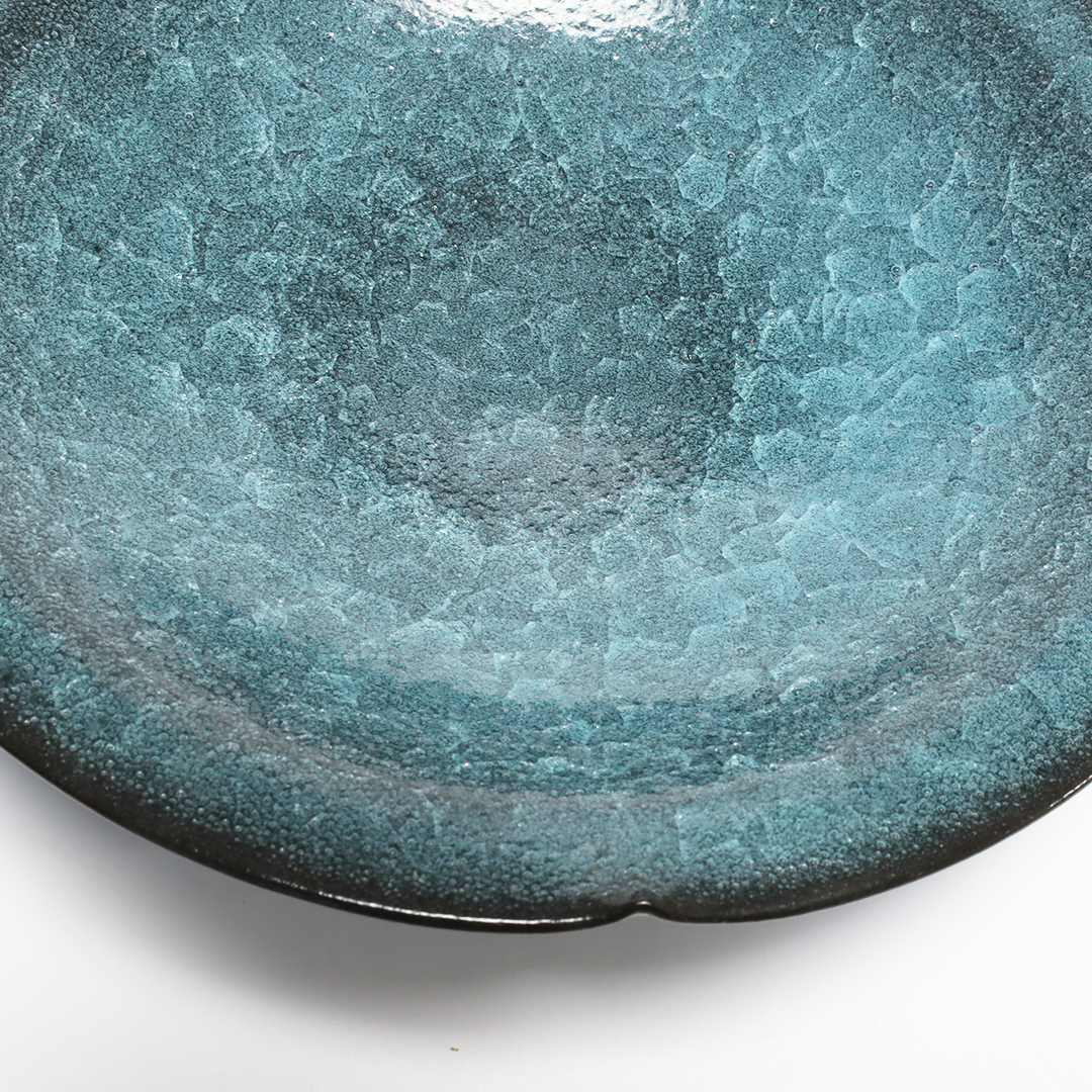 釉薬の種類のひとつである氷裂貫入釉の作品で、素地の土と釉薬の焼いた時の収縮率の違いによって起こる細かな貫入(ガラスのひび割れのこと)が特長で、 氷が割れたように見える表現方法の一つです。
