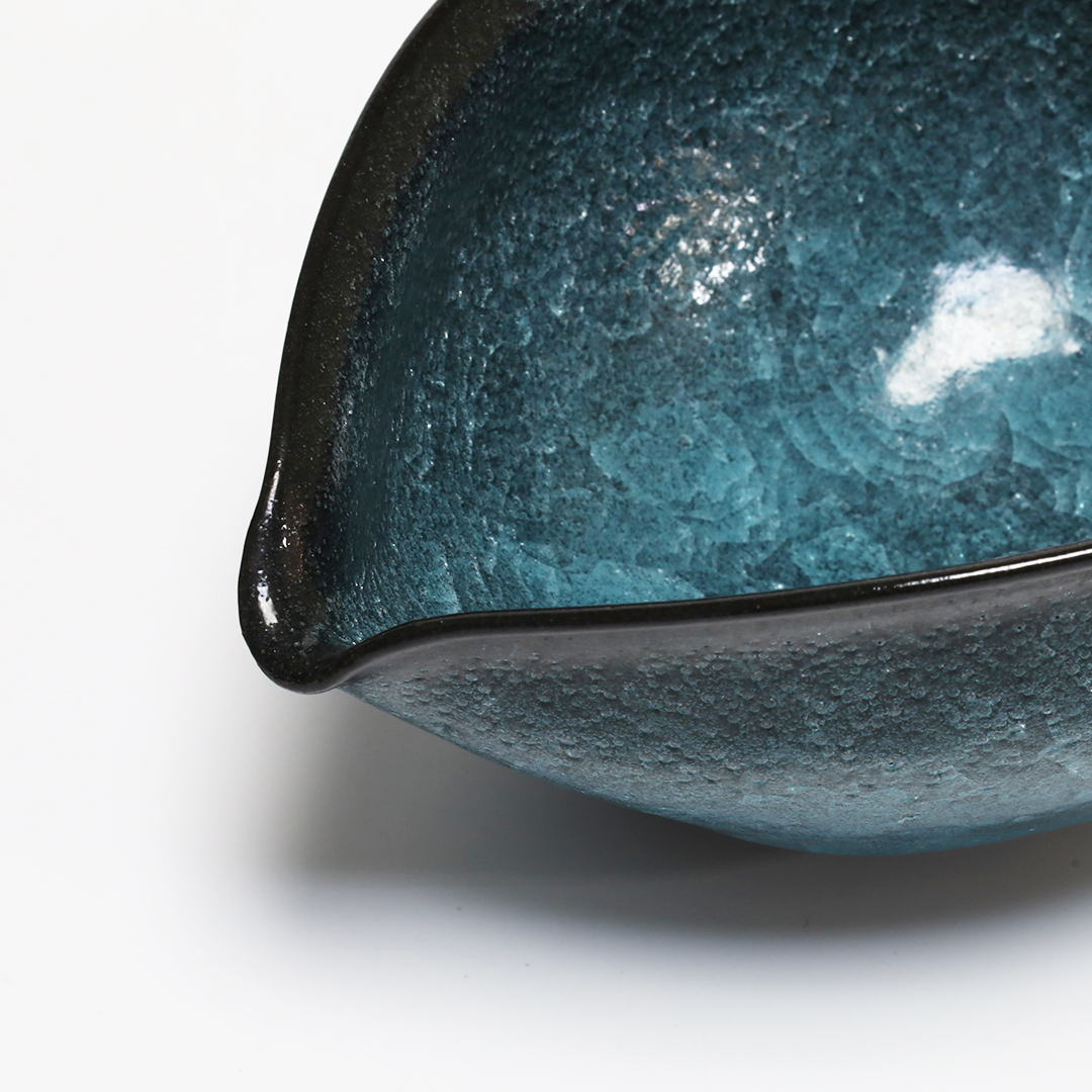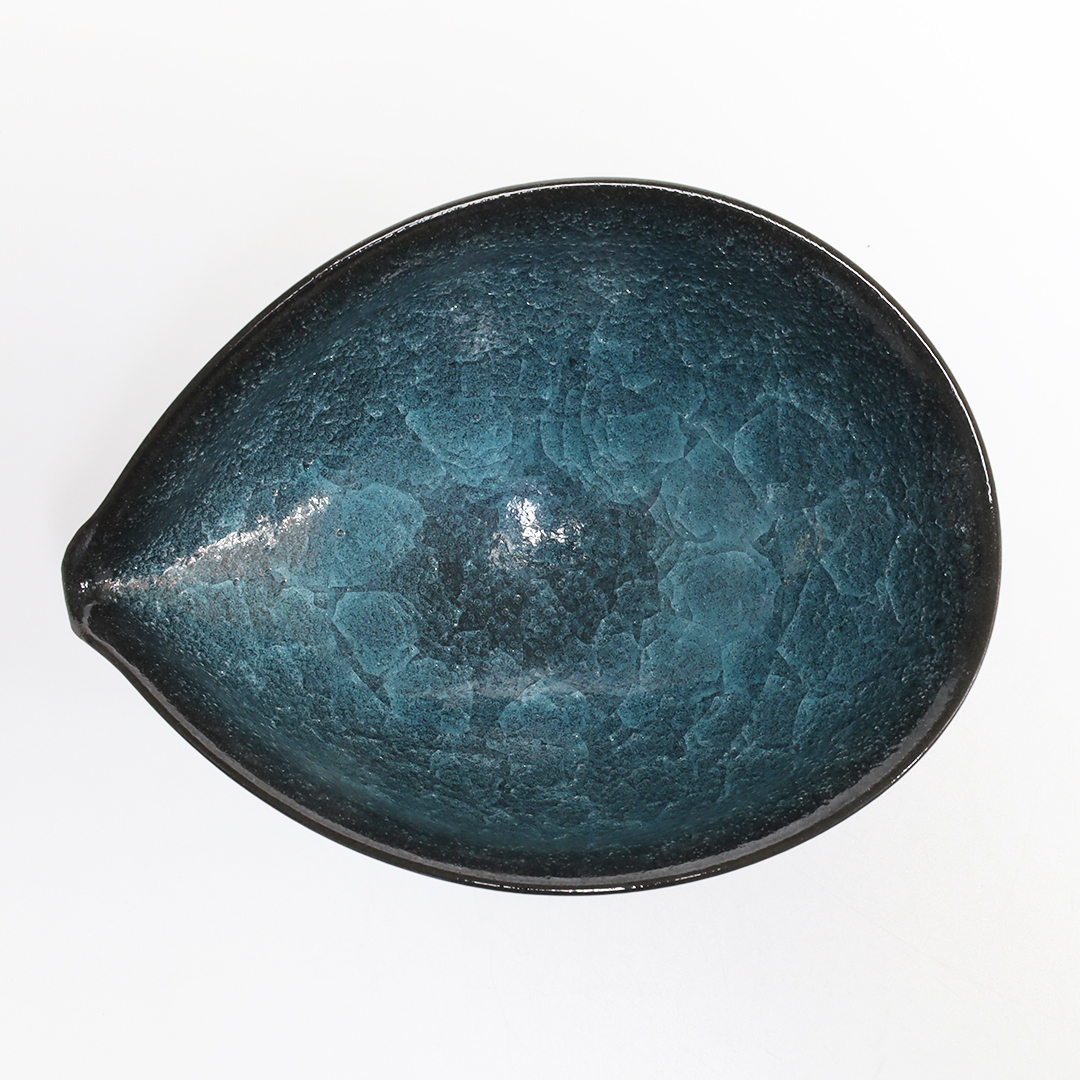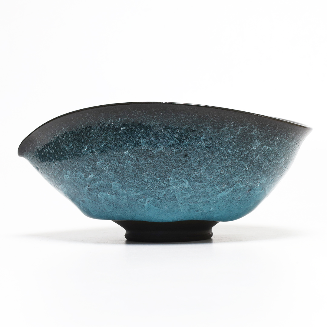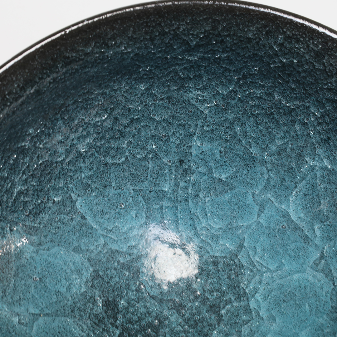 釉薬の種類のひとつである氷裂貫入釉の作品で、素地の土と釉薬の焼いた時の収縮率の違いによって起こる細かな貫入(ガラスのひび割れのこと)が特長で、 氷が割れたように見える表現方法の一つです。