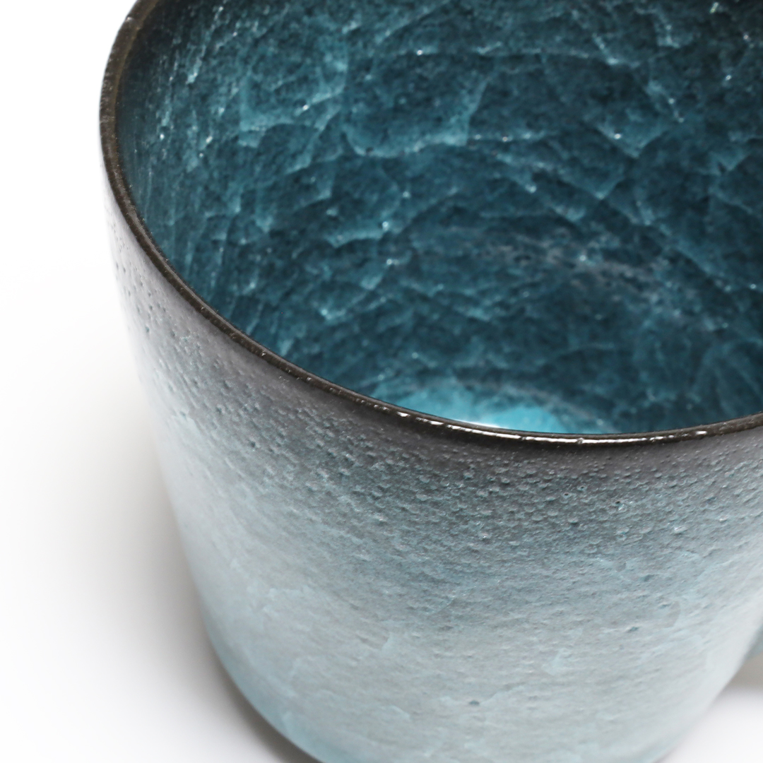 釉薬の種類のひとつである氷裂貫入釉の作品で、素地の土と釉薬の焼いた時の収縮率の違いによって起こる細かな貫入(ガラスのひび割れのこと)が特長で、 氷が割れたように見える表現方法の一つです。