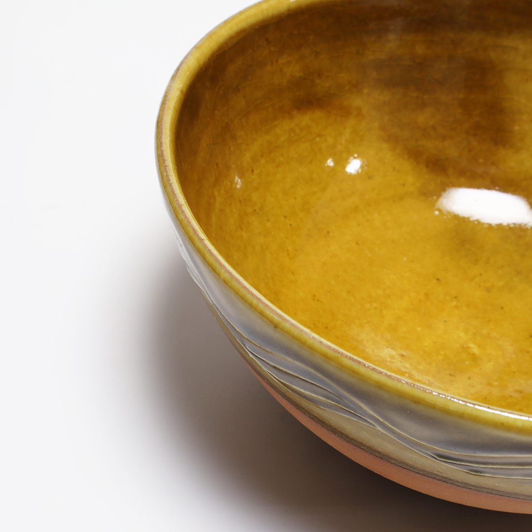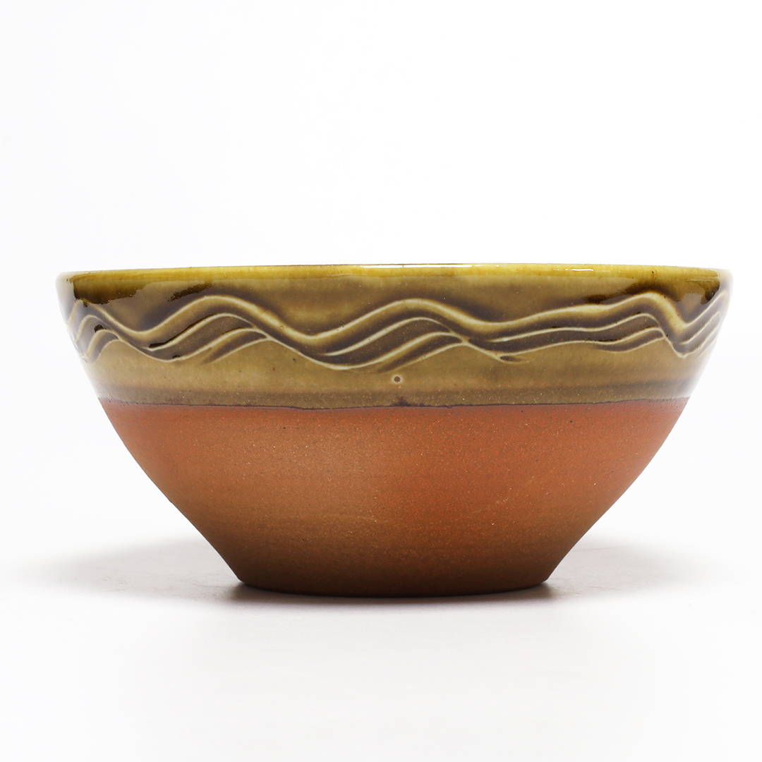 厚みのあるポッテリとした形状に柔らかみがあり、温かみのあるスリップウェアが特徴です。
