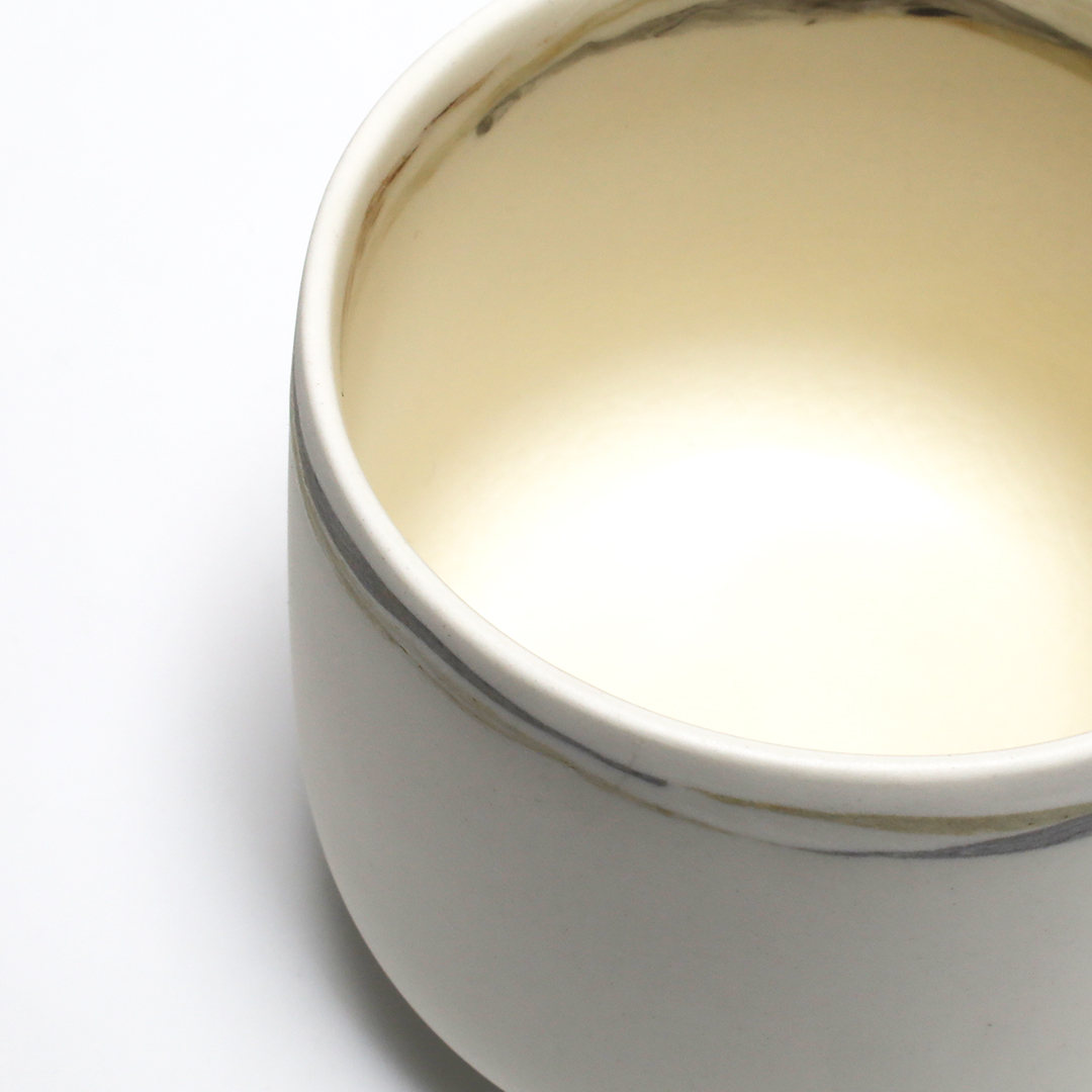 紐状の粘土を積み上げて成形し、その際、紐の太さや長さを変えて積み上げていくことで、地層のような模様を形成しています。