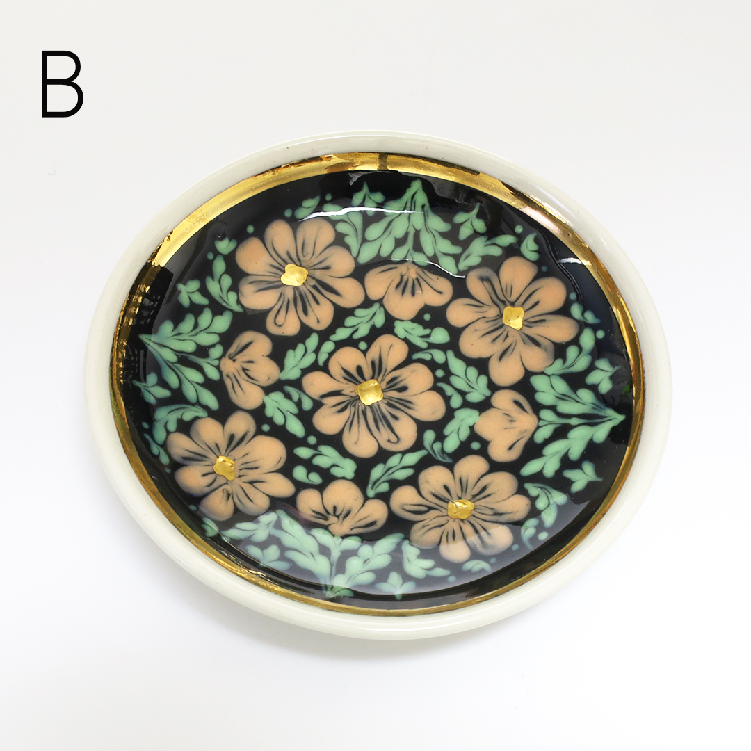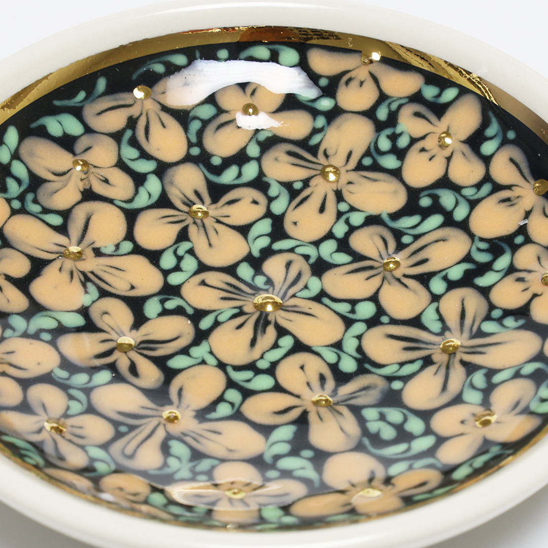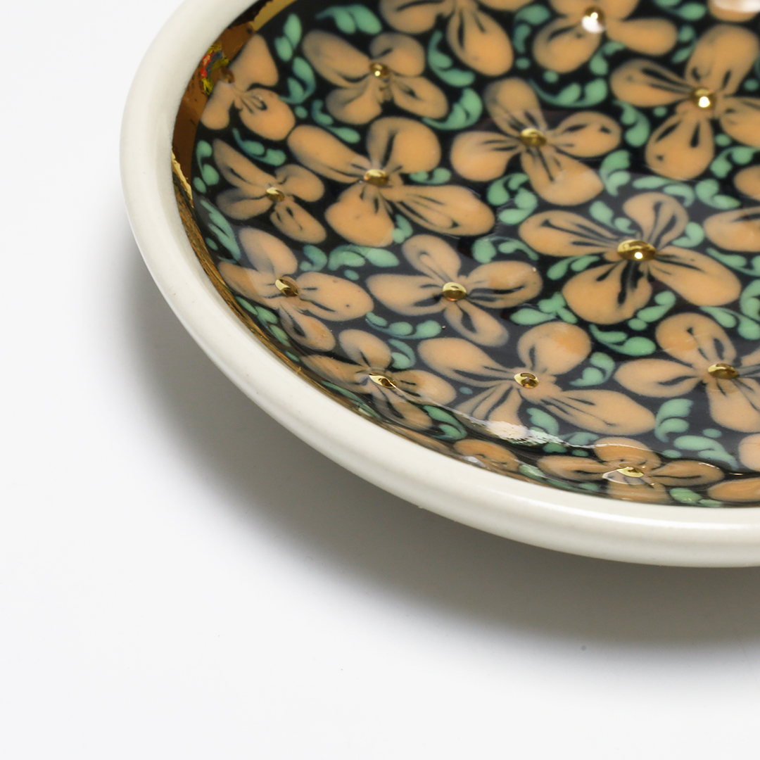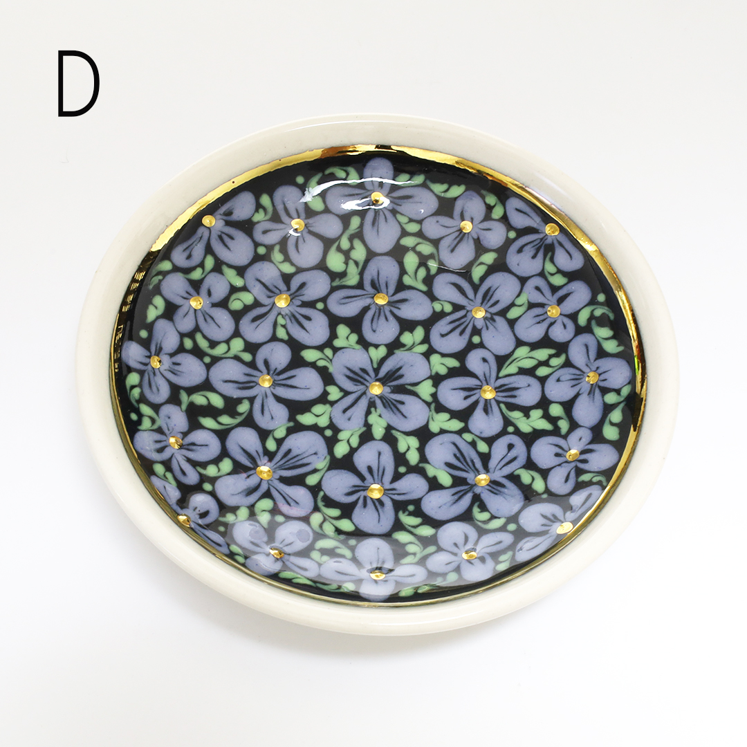 スリップウェアや和紙染めの技法を用いて、華やかな草花を描かれています。