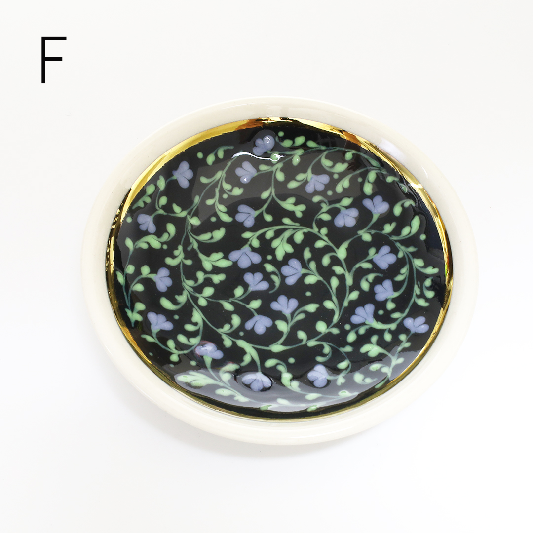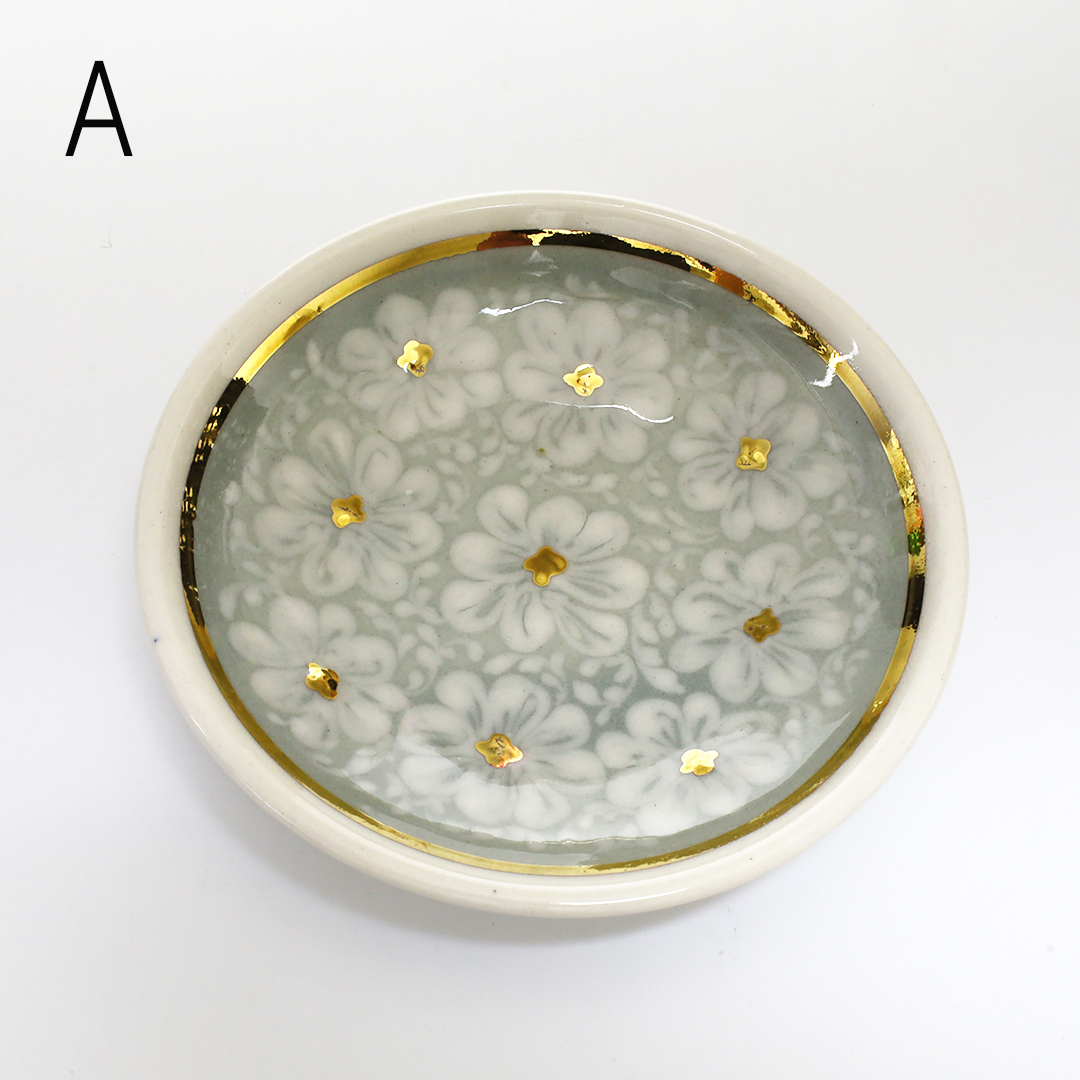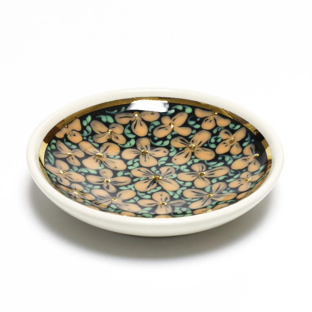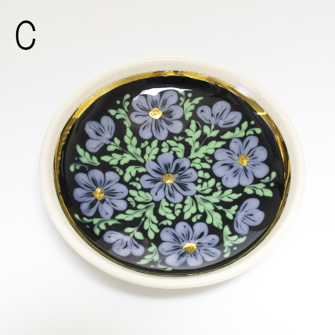 スリップウェアや和紙染めの技法を用いて、華やかな草花を描かれています。