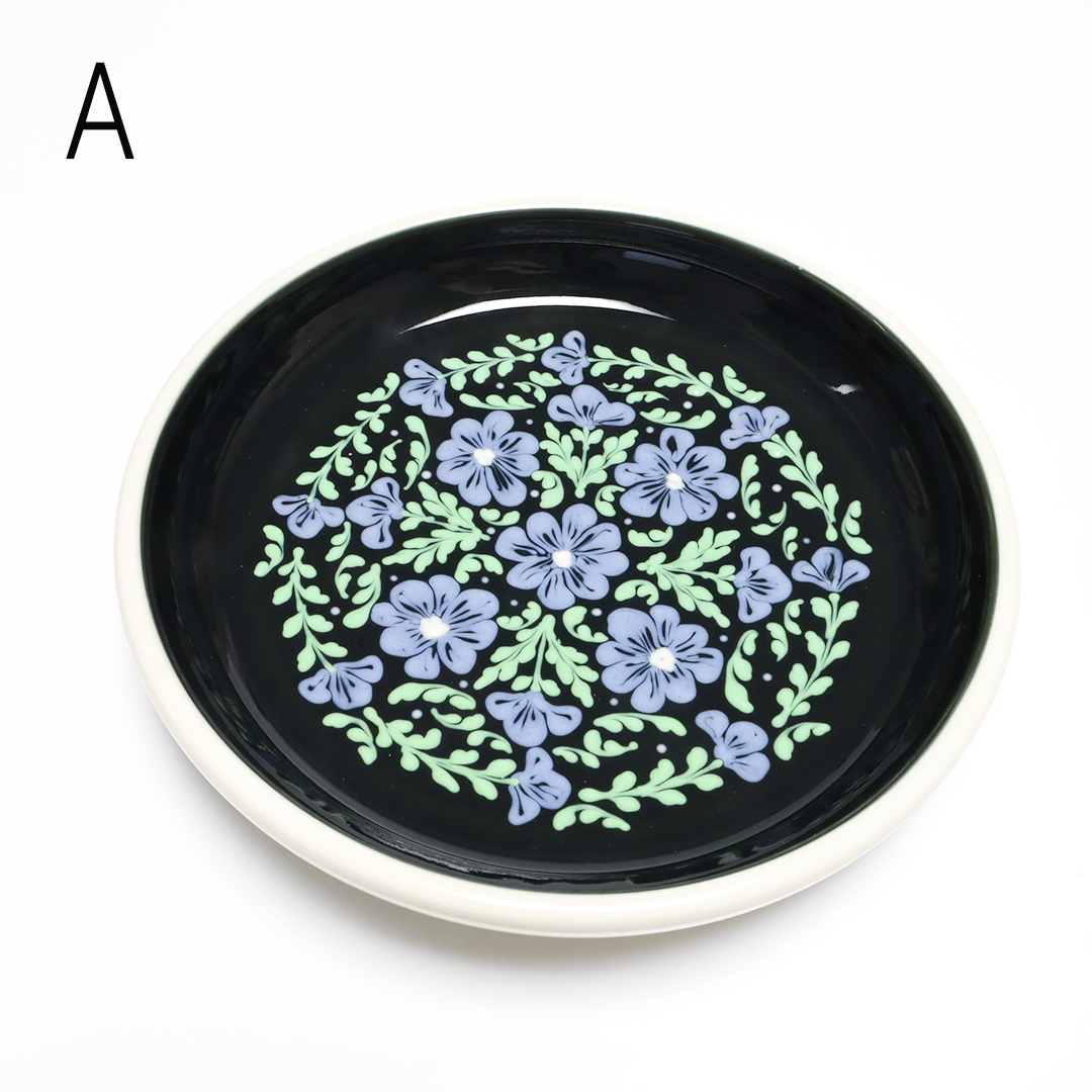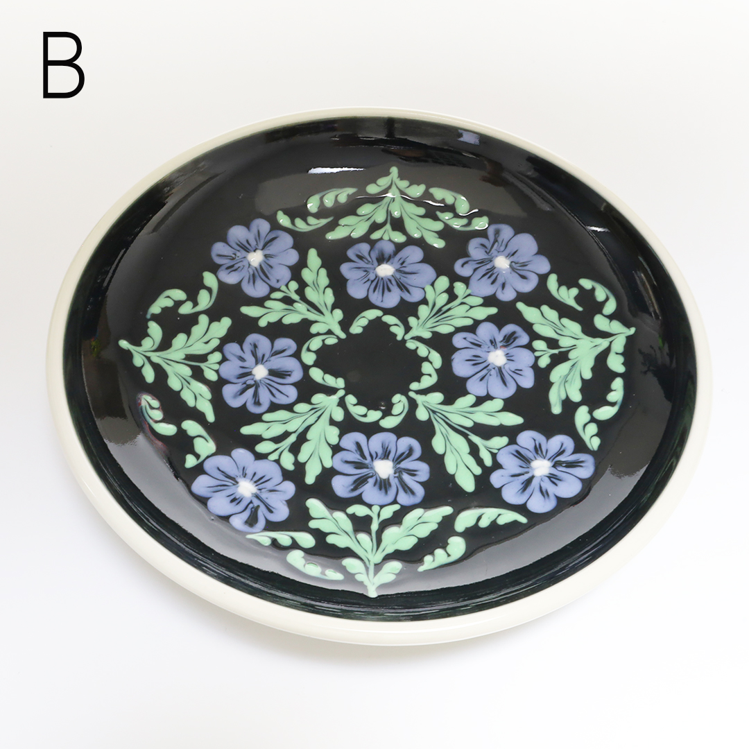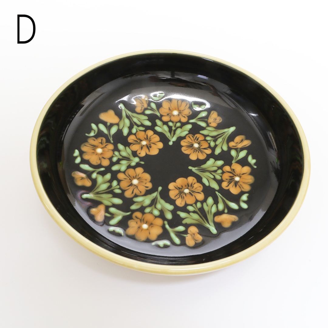 スリップウェアや和紙染めの技法を用いて、華やかな草花を描かれています。