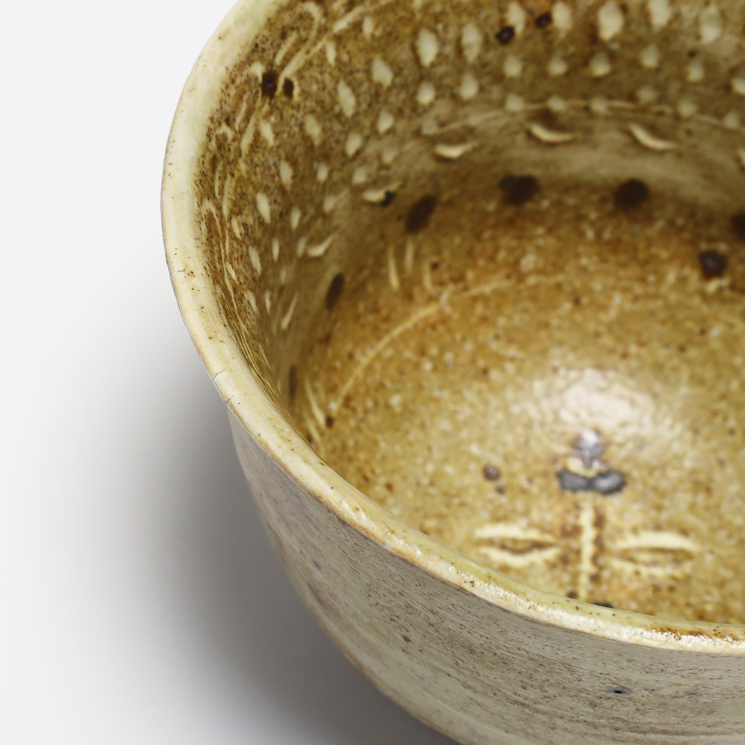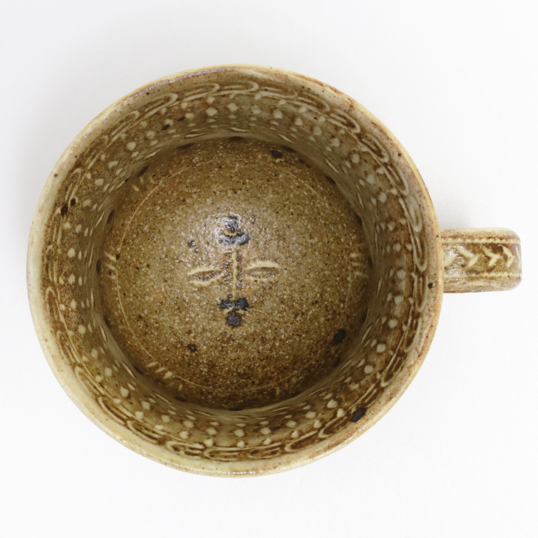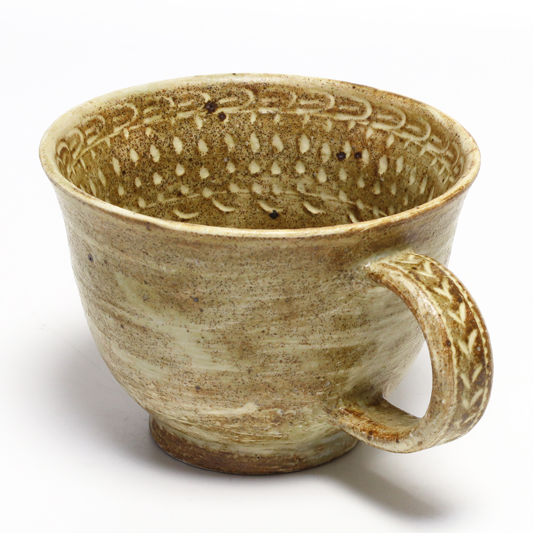 自作の判子や貝殻を押し当てて出来た凹みに化粧土を埋め込んで紋様を描き、完全に乾燥させてからヤスリで化粧土を落とすことで、柔らかい表情の器に仕上げてあります。