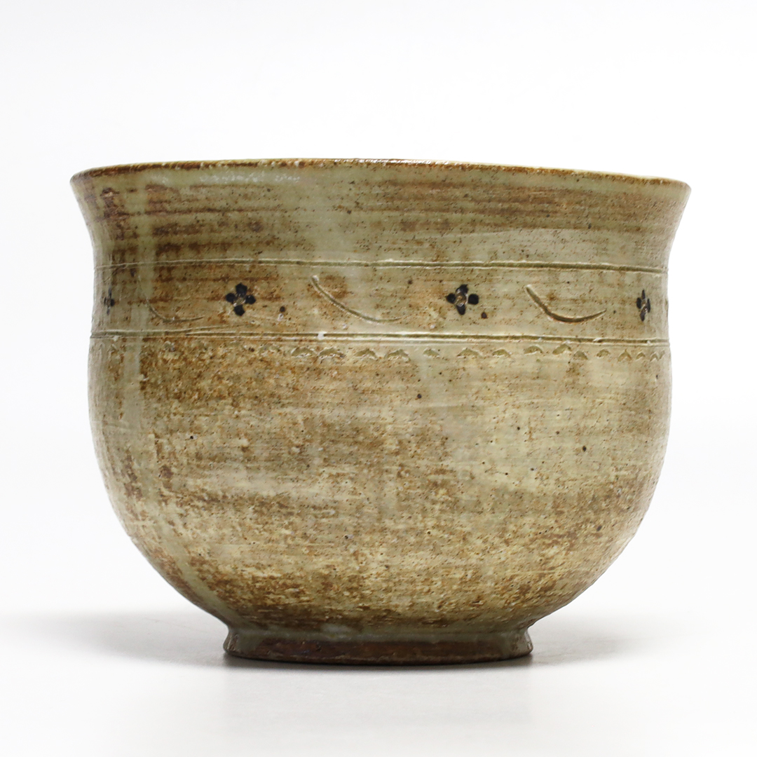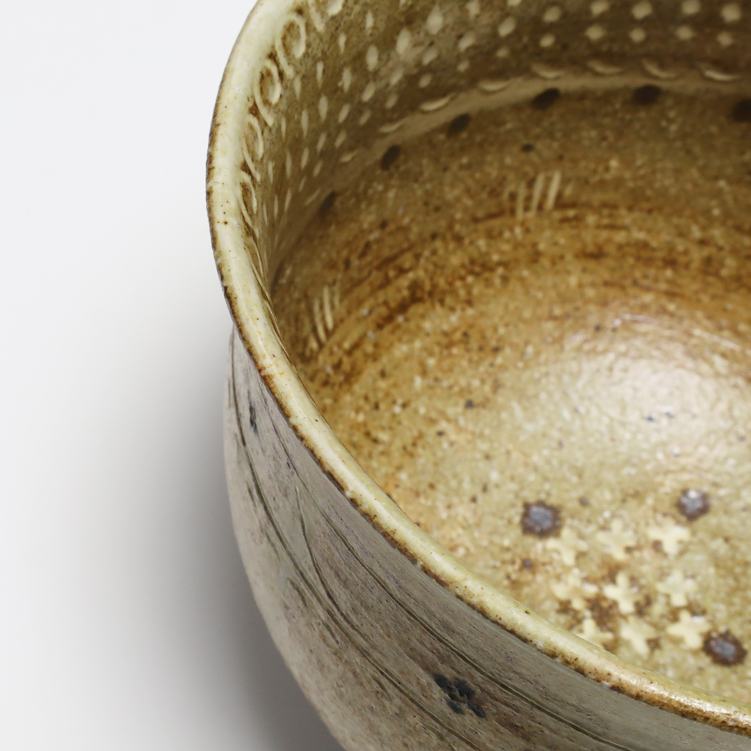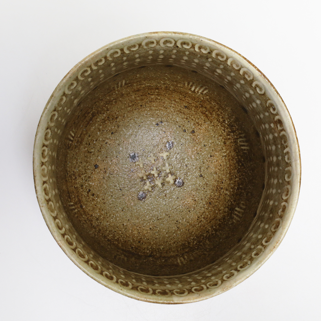 自作の判子や貝殻を押し当てて出来た凹みに化粧土を埋め込んで紋様を描き、完全に乾燥させてからヤスリで化粧土を落とすことで、柔らかい表情の器に仕上げてあります。