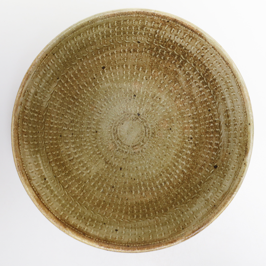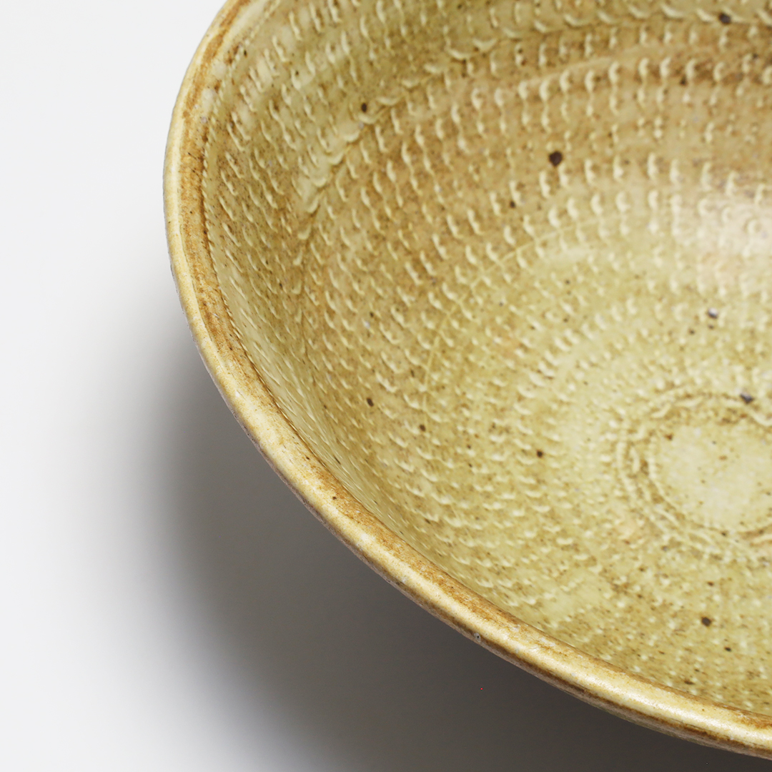 自作の判子や貝殻を押し当てて出来た凹みに化粧土を埋め込んで紋様を描き、完全に乾燥させてからヤスリで化粧土を落とすことで、柔らかい表情の器に仕上げてあります。
