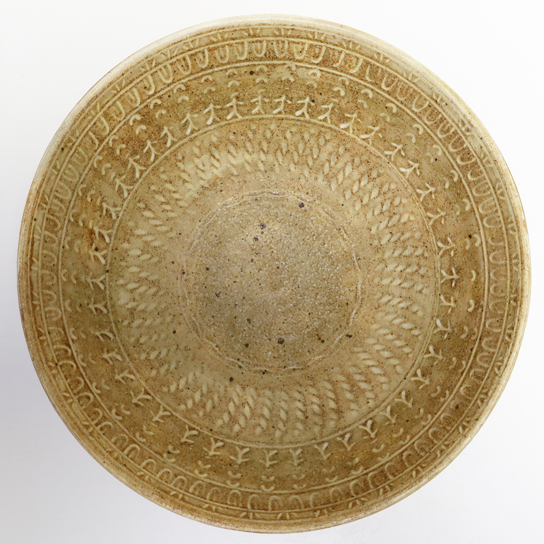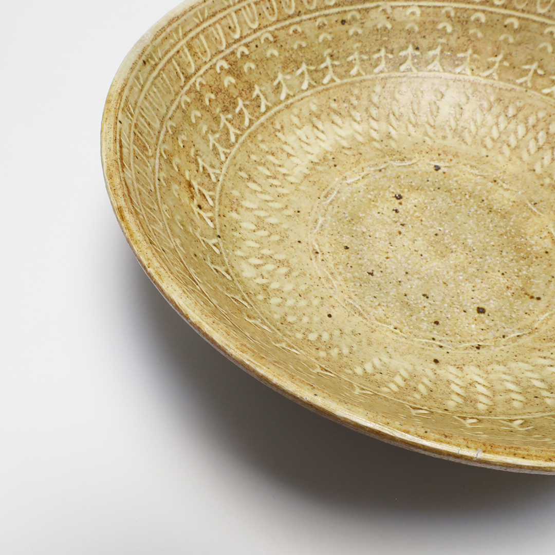 自作の判子や貝殻を押し当てて出来た凹みに化粧土を埋め込んで紋様を描き、完全に乾燥させてからヤスリで化粧土を落とすことで、柔らかい表情の器に仕上げてあります。