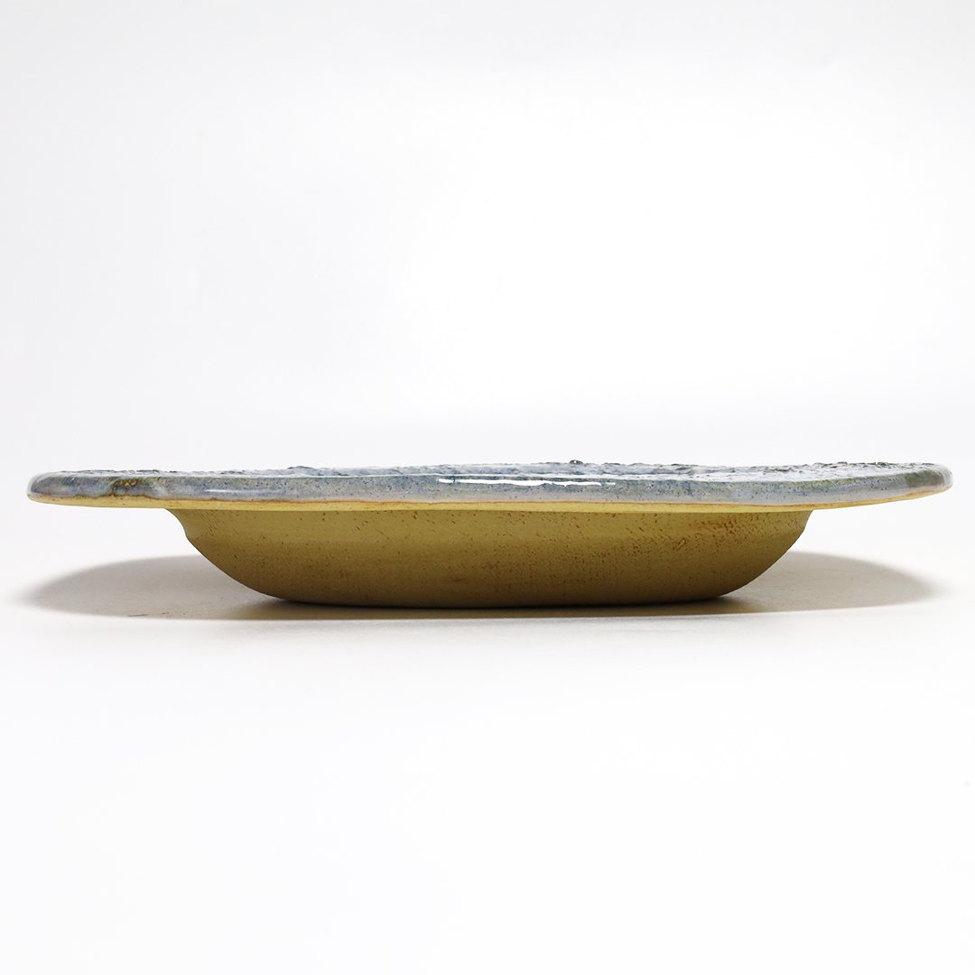 沖縄県読谷村で作陶されています。特徴的なオリジナルのブルーの釉薬を使用しているので、沖縄の自然を感じる、シンプルなのに一度見たら忘れない印象に残る器です。厚みがあるので、しっかりした重みがあります。