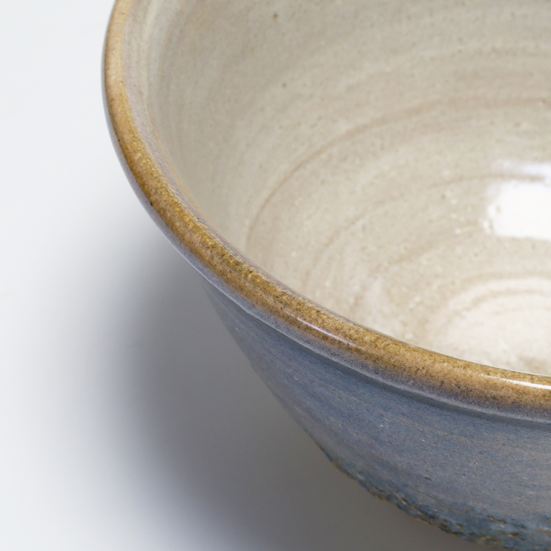 沖縄県読谷村で作陶されています。特徴的なオリジナルのブルーの釉薬を使用しているので、沖縄の自然を感じる、シンプルなのに一度見たら忘れない印象に残る器です。厚みがあるので、しっかりした重みがあります。