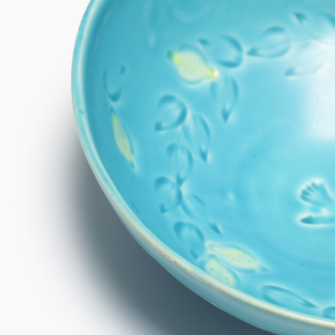 陶器で作った印を押して模様にしており、植物ひとつひとつ咲き方が違うように、押した加減によって風合いや濃淡が変わる模様を楽しめます。