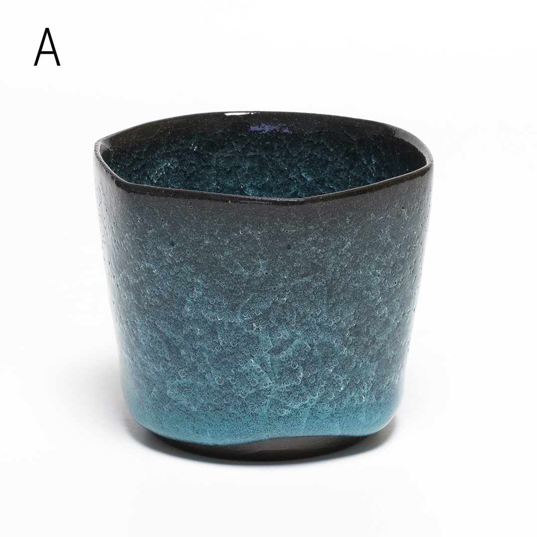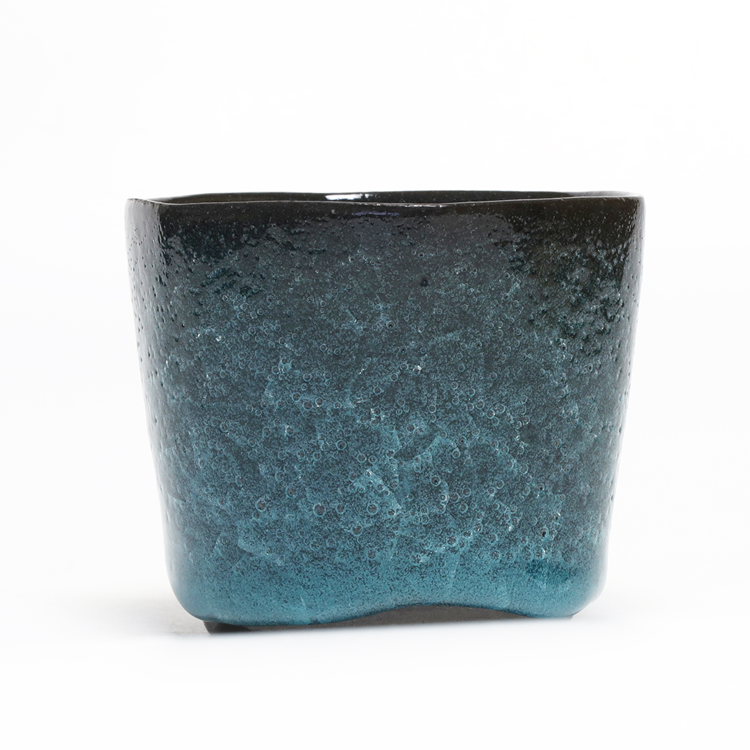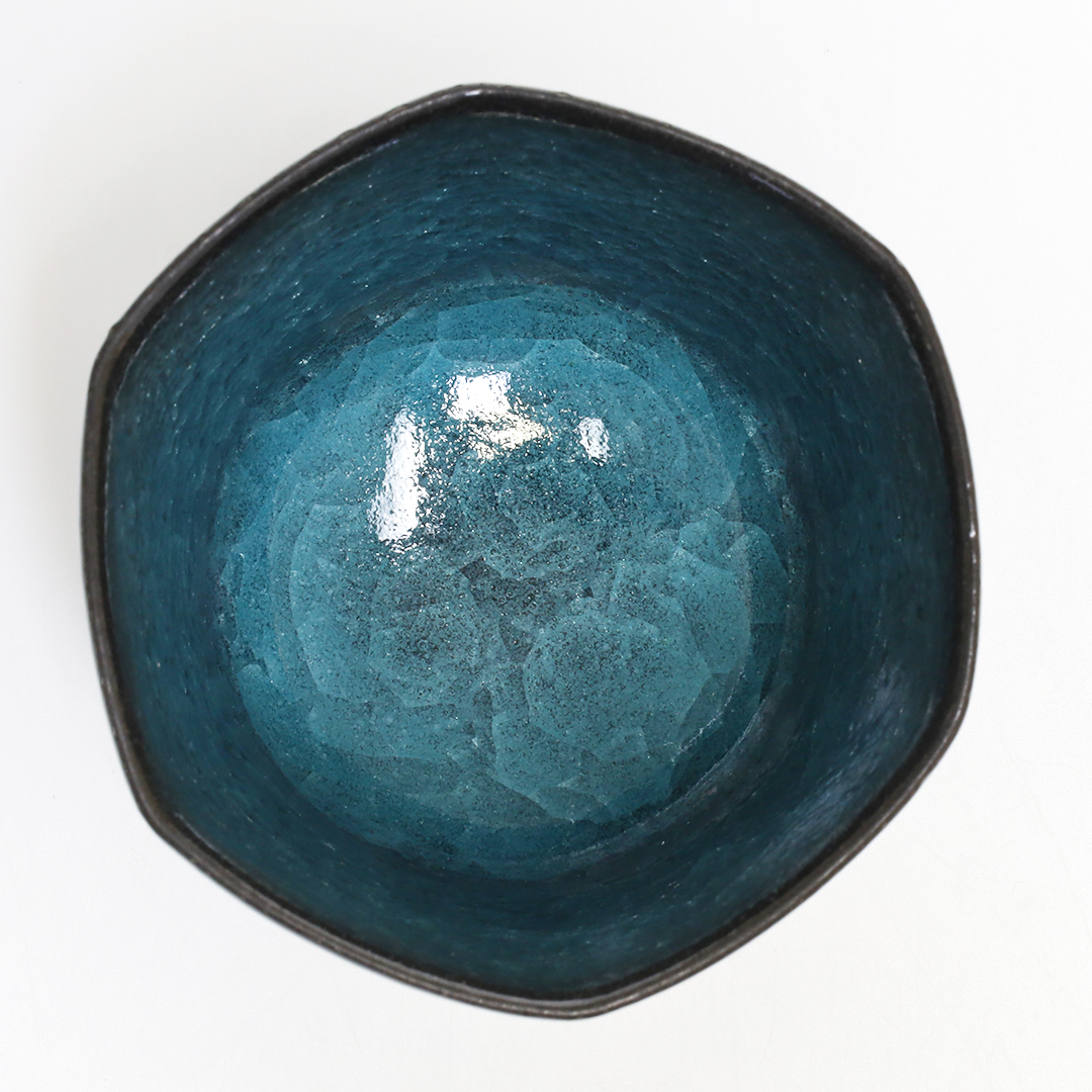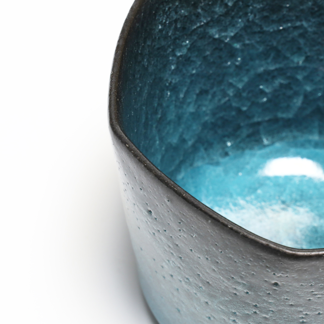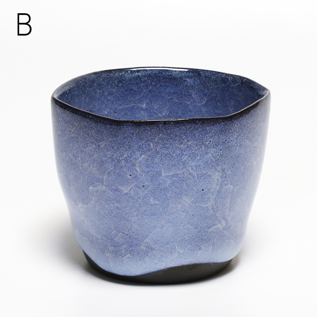釉薬の種類のひとつである氷裂貫入釉の作品で、素地の土と釉薬の焼いた時の収縮率の違いによって起こる細かな貫入(ガラスのひび割れのこと)が特長で、 氷が割れたように見える表現方法の一つです。