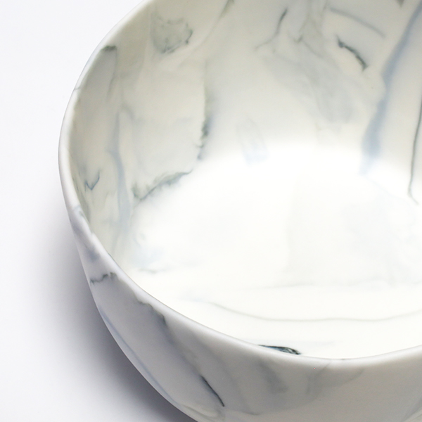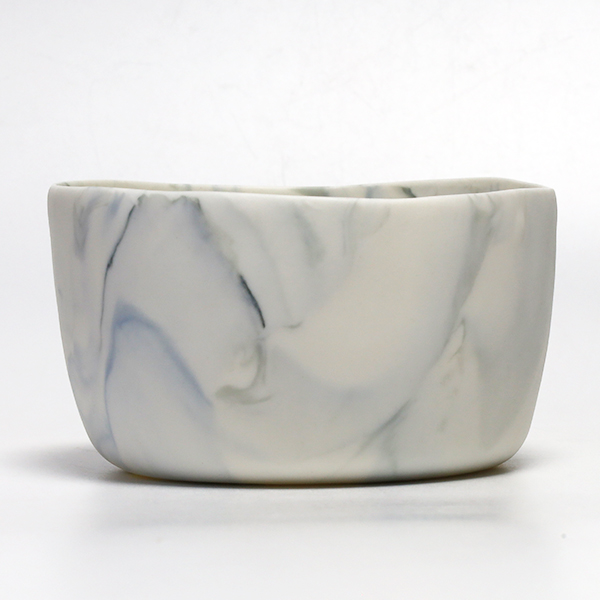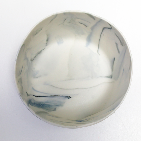 従来の練り込みの技法に泥漿を組み合わせることで色と色が溶け合い、境界が曖昧になるような揺らぎのある模様が生まれます。透光性があり、光にかざすと仄かに透けるうつわです。