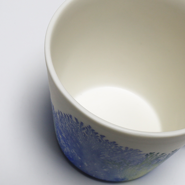 下絵具を3~4種類用いることで、透光性のある磁土に水彩画のようなグラデーションが溶けるようにして馴染みます。